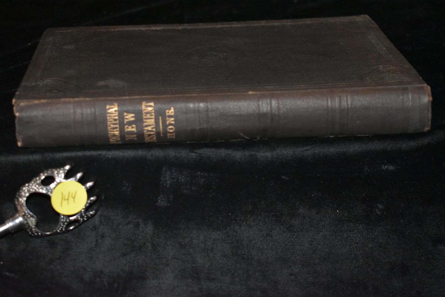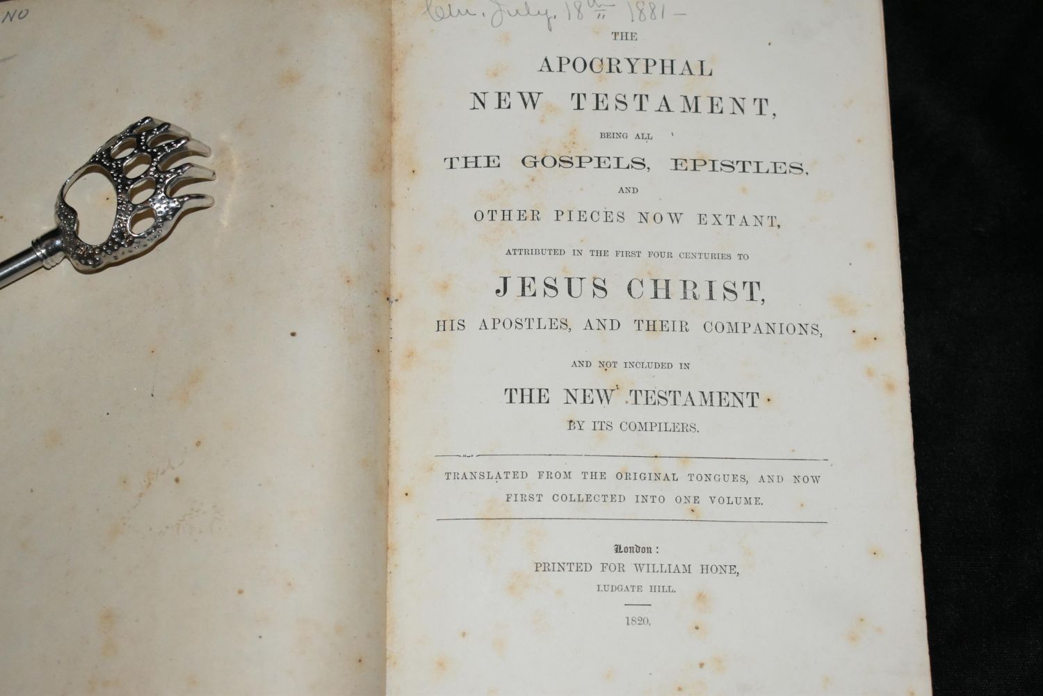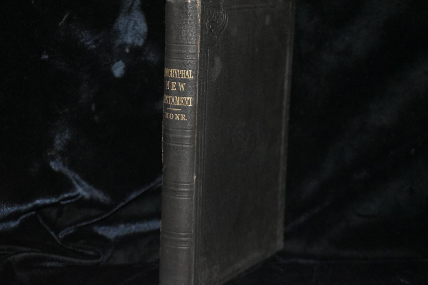 1820 THE APOCRYPHAL NEW TESTAMENT, being all THE GOSPELS, EPISTLES and OTHER PIECES NOW EXTANT. Published by William Hone, Ludgate Hill, London, England (1820). Hardback Black embossed Cloth with gold Gilt on the Spine. Good Condition for its age. It has a small section of the cover page missing down toward the bottom. Page Foxing and shelf wear t the cover. One of the last pages of the book which was blank was written on by its first owner with a critique of the book. 271 pgs. 9" by 5 7/8"