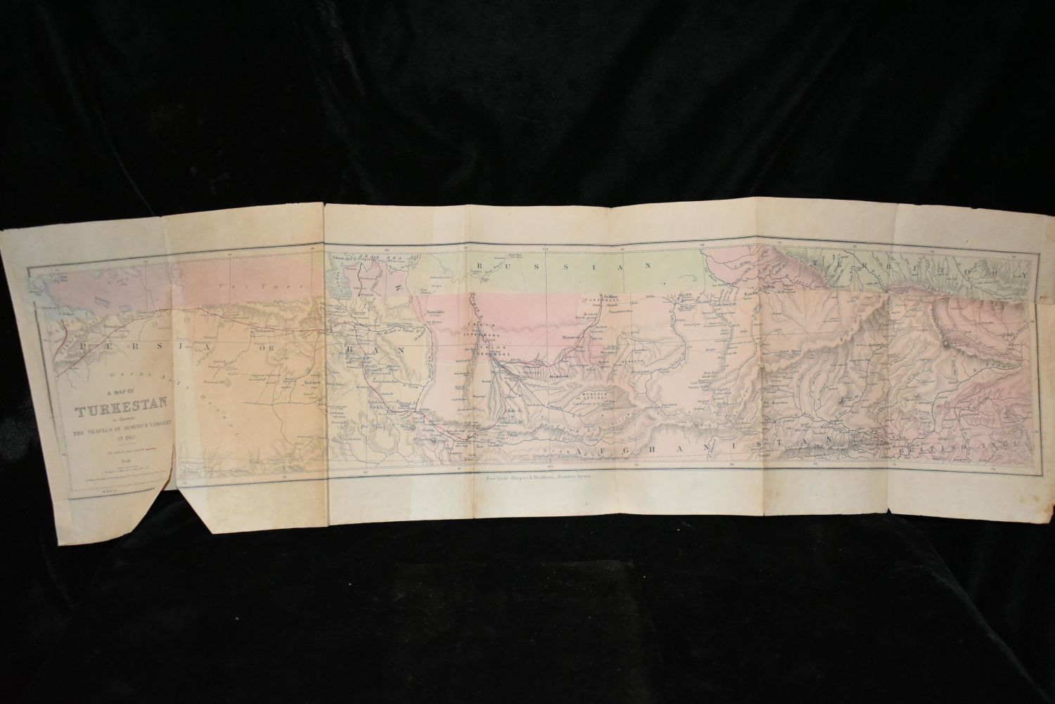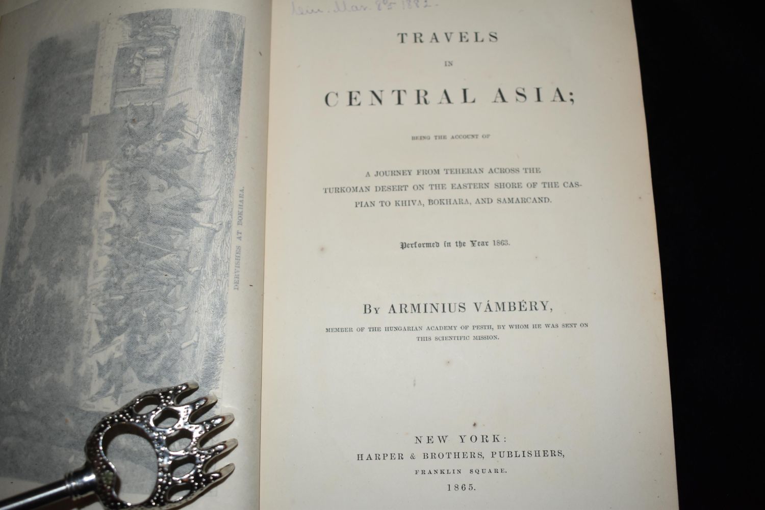 1865 TRAVELS IN CENTRAL ASIA by Arminius Vamberry. Published by Harper and Brothers 1865. Travels in Central Asia Being the Account of A Journey From Teheran Across the Turkoman Desert on the Eastern Shore of the Caspian to Khiva, Bokhara and Samarcand, Performed in the Year 1863. First American Edition. Publishers Green Cloth Embossed and gold Gilt on the spine. This Book is in Excellent condition for its age. Foxing on a few pages. 493 pages and a map. 9 3/8" by 6 3/8"