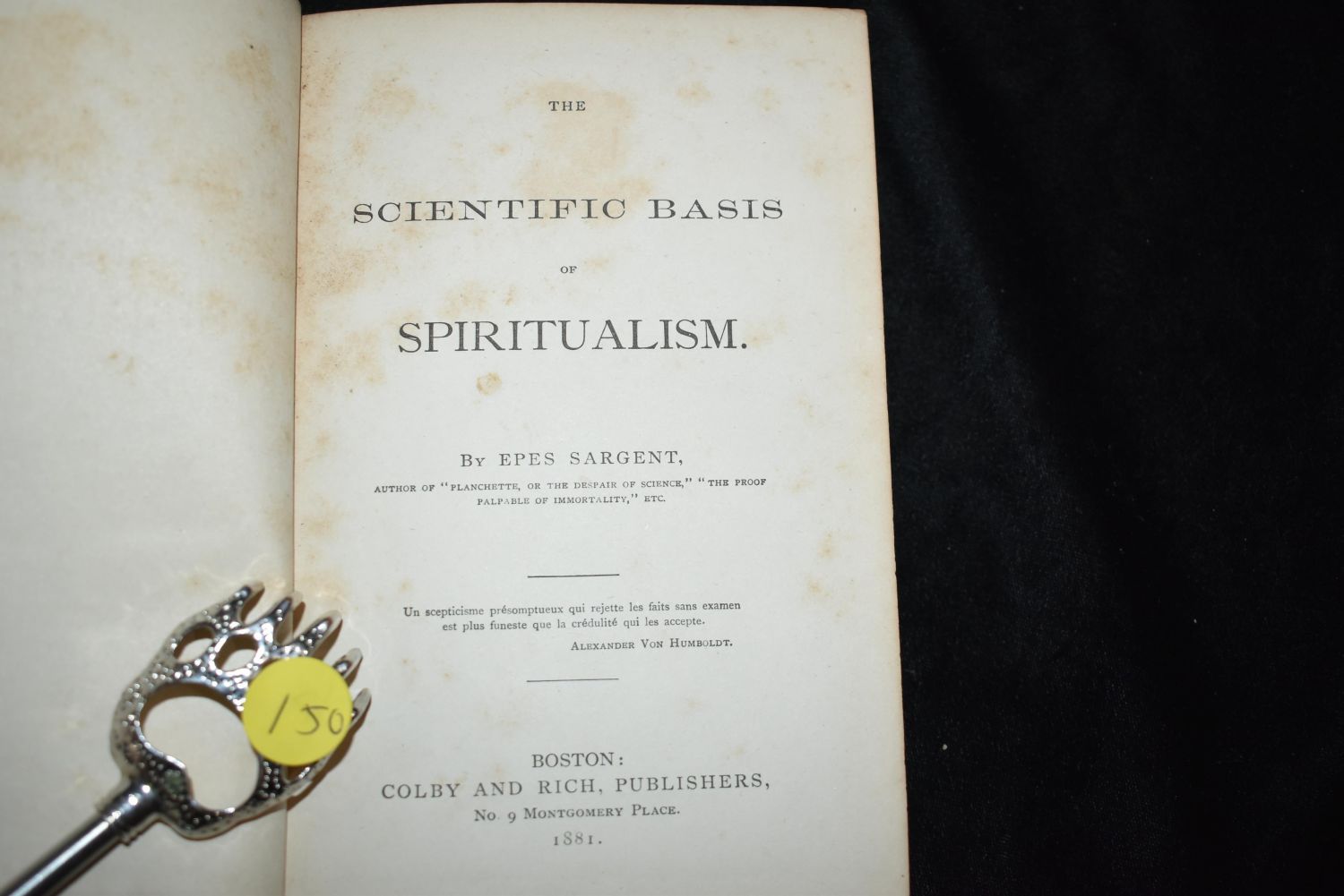 1881 THE SCIENTIFIC BASIS OF SPIRITUALISM by Epes Sargent. Published by Colby and Rich 1881. Publishers Brown Cloth with Gold Gilt to Spine. Good Condition with some shelf wear to corners and spine. Notes regarding Theosophy hand written in the back of the book. 372 pages 7 1/2" by 5"