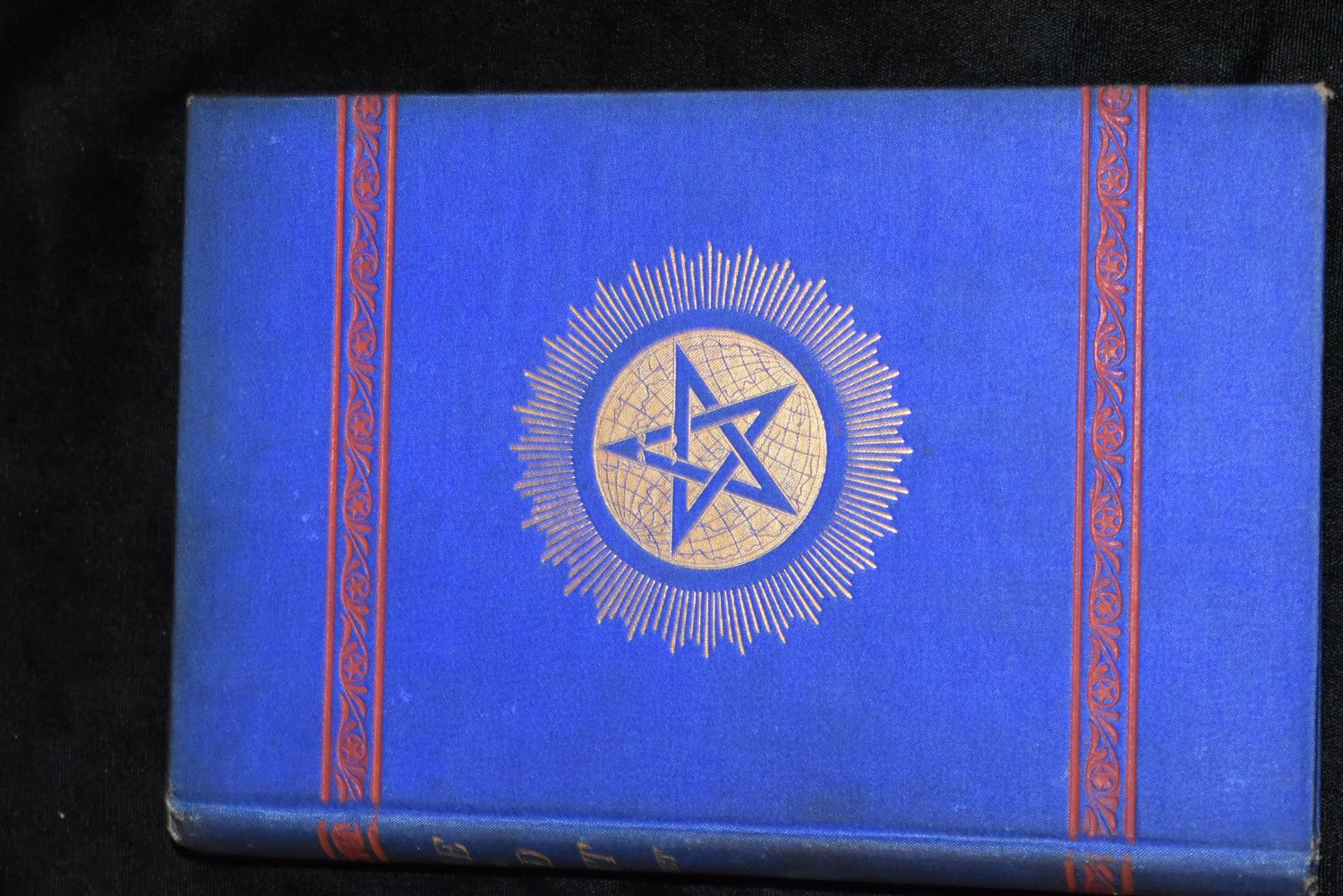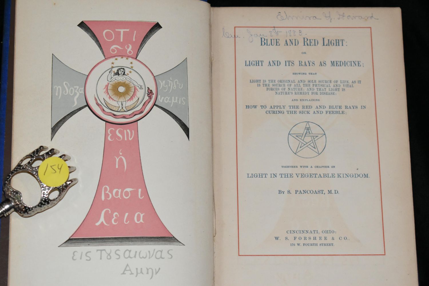 1877 BLUE AND RED LIGHT: LIGHT AND ITS RAYS AS MEDICINE by S. Pancoast. Published by W. S. Forshee & Co. Theory of light and its medical applications by Seth Pancoast (1823-1889), physician, Kabbalist, and founding member of the Theosophical Society. First edition. Octavo. 312pp. Plates, including folding. Blue cloth decorated in red and gilt. Printed in blue and red. Very Good for its age. Minor shelf wear. 8 3/5" by 5 5/8"