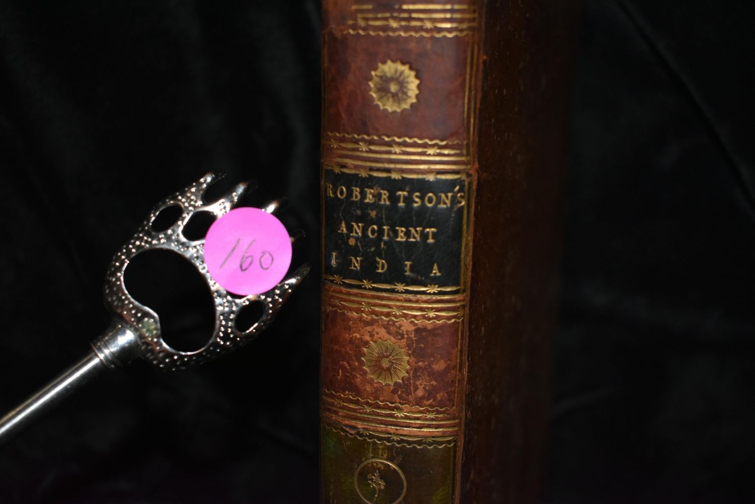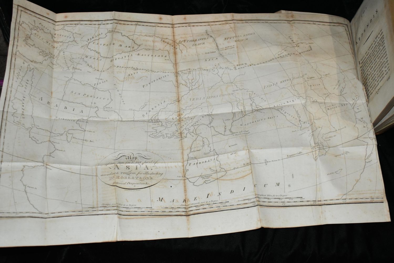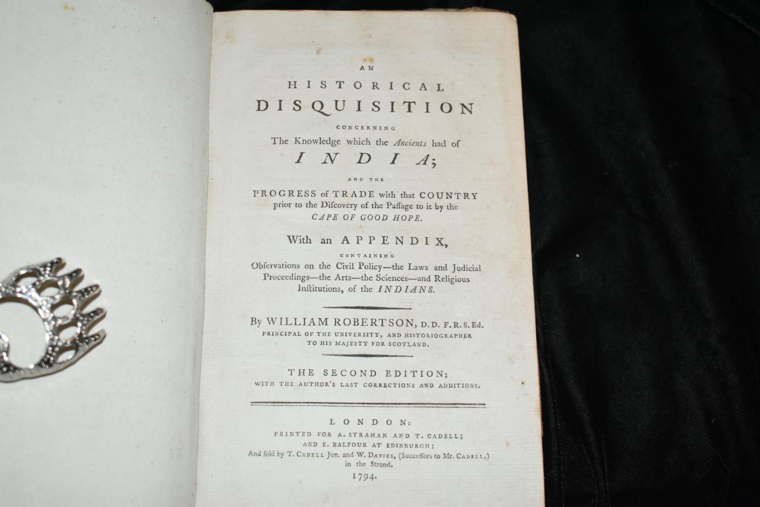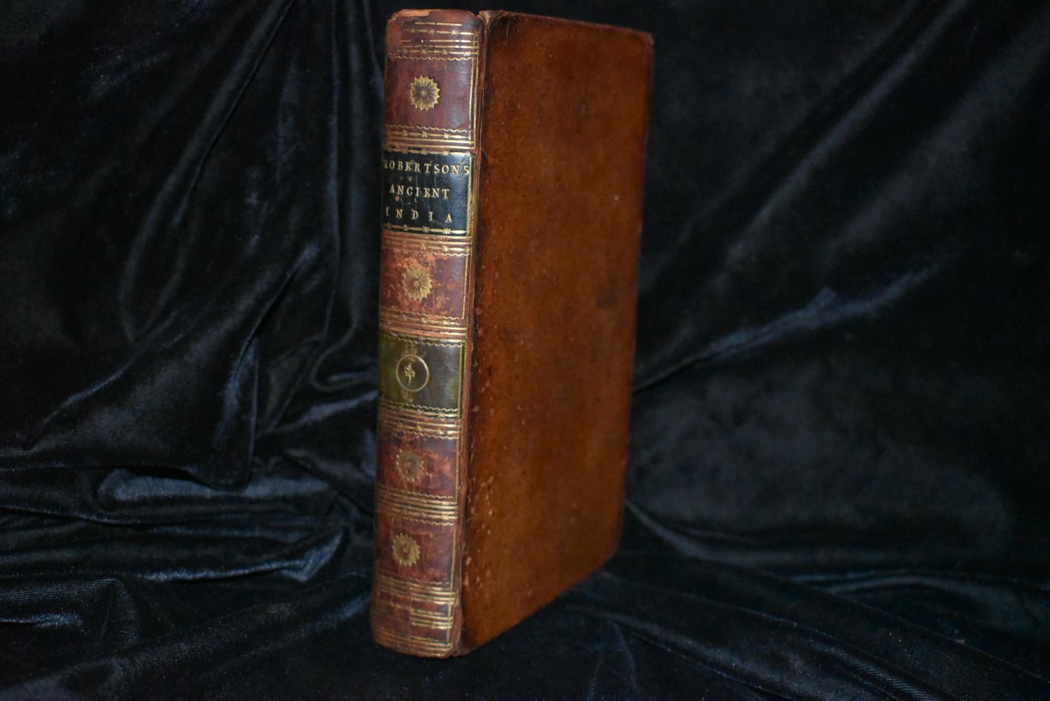 1794 AN HISTORICAL DISQUISITION of INDIA An Historical Disquisition concerning the Knowledge which the Ancients had of India; and the Progress of Trade with that Country prior to the Discovery of the Passage to it by the Cape of Good Hope. With an Appendix, containing Observations on the Civil Policy – The Laws and Judicial Proceedings – the Arts – the Sciences – and Religious Institutions, of the Indians. by William Robertson. Second Edition. London: Printed for A. Strahan and T Cadell. Good Condition with 2 fold out Maps inside. Full Leather with gold embossing. Shelf Wear to board edges and corners. Foxing to most pages. 441 pgs. 8 1/2" by 5 1/2"