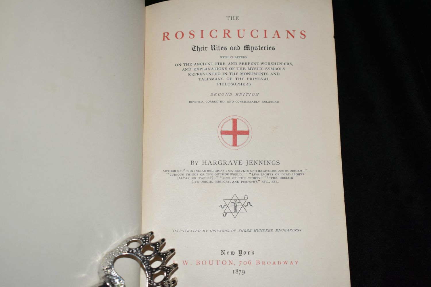 ROSICRUCIANS THEIR RITES AND MYSTERIES 1879 by Hargrave Jennings. Published by J. W. Bouton, New York 1879. Chapters on the Ancient Fire- and Serpent-worshippers, and Explanations of the Mystic Symbols Represented in the Monuments and Talismans of the Primeval Philosophers. Second Edition. Blue cloth with red bands and gilt decoration to front board, red decoration to back board, and gilt particulars with a Rosicrucian emblem to spine. Very Good Condition with minor shelf wear. 372 pgs 7 3/4" by 5 1/2"