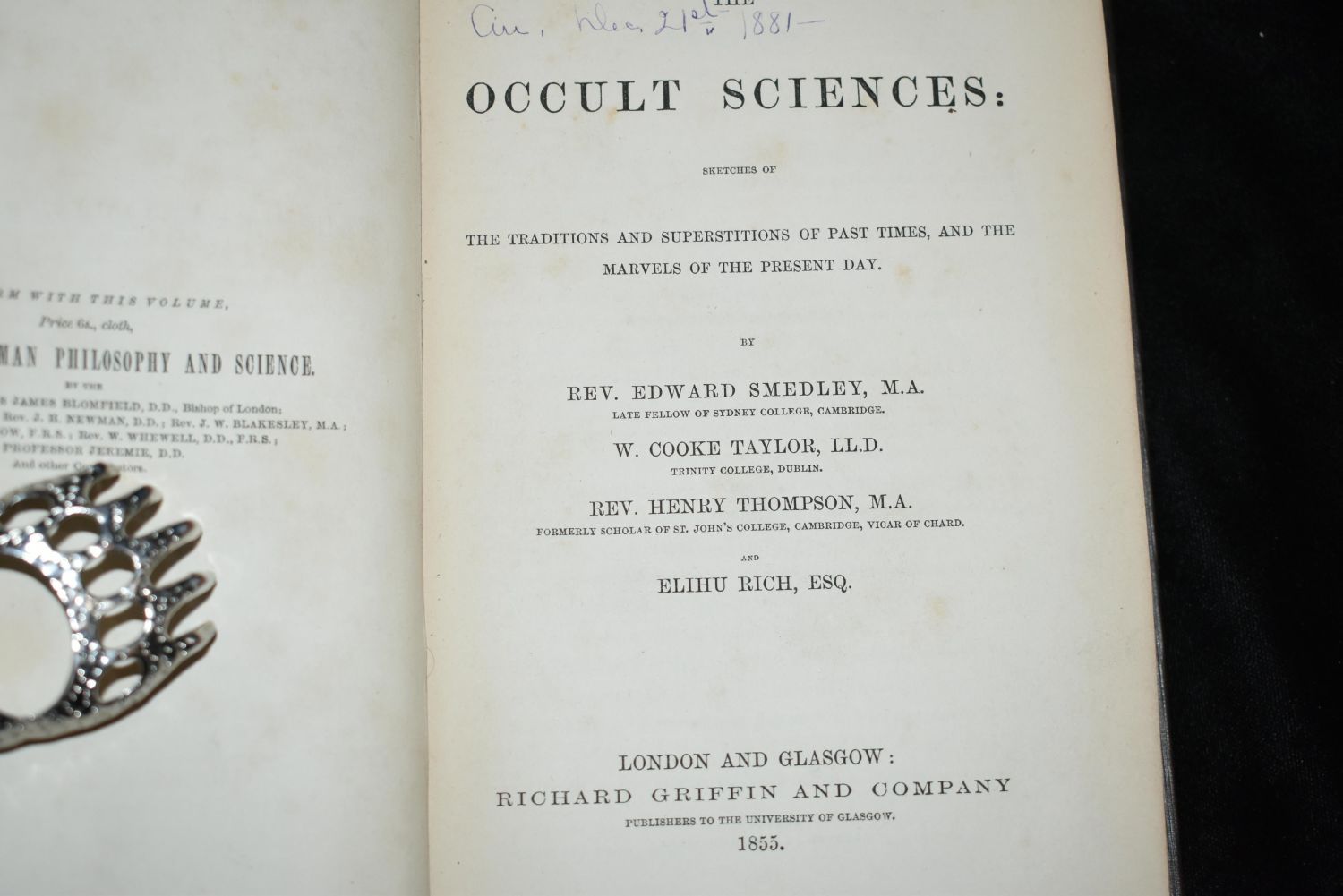 OCCULT SCIENCES 1855 by Edward Smedley; William Cooke Taylor; Henry Thompson and Elihu Rich. Published by Richard Griffin and Company 1855. Sketches of the traditions and superstitions of past times, and the marvels of the present day. Publishers embossed Black Cloth with gold gilt. Fair Condition. Would be good but is missing the upper 1/3 of the Spine. 376 pgs 7 3/4" by 5 1/4"
