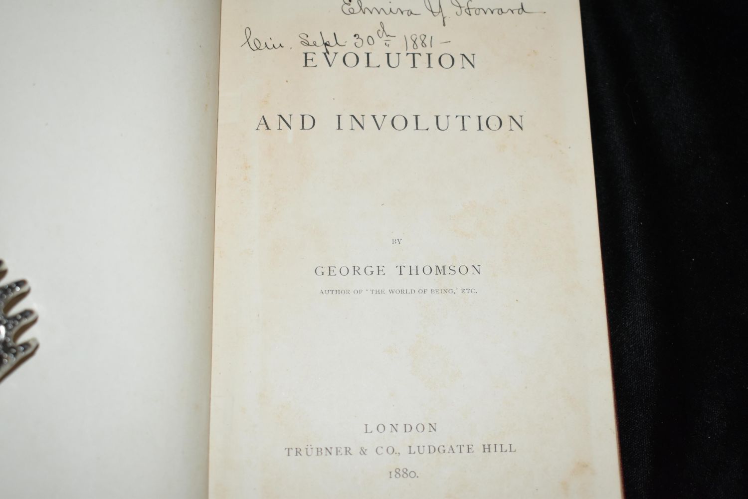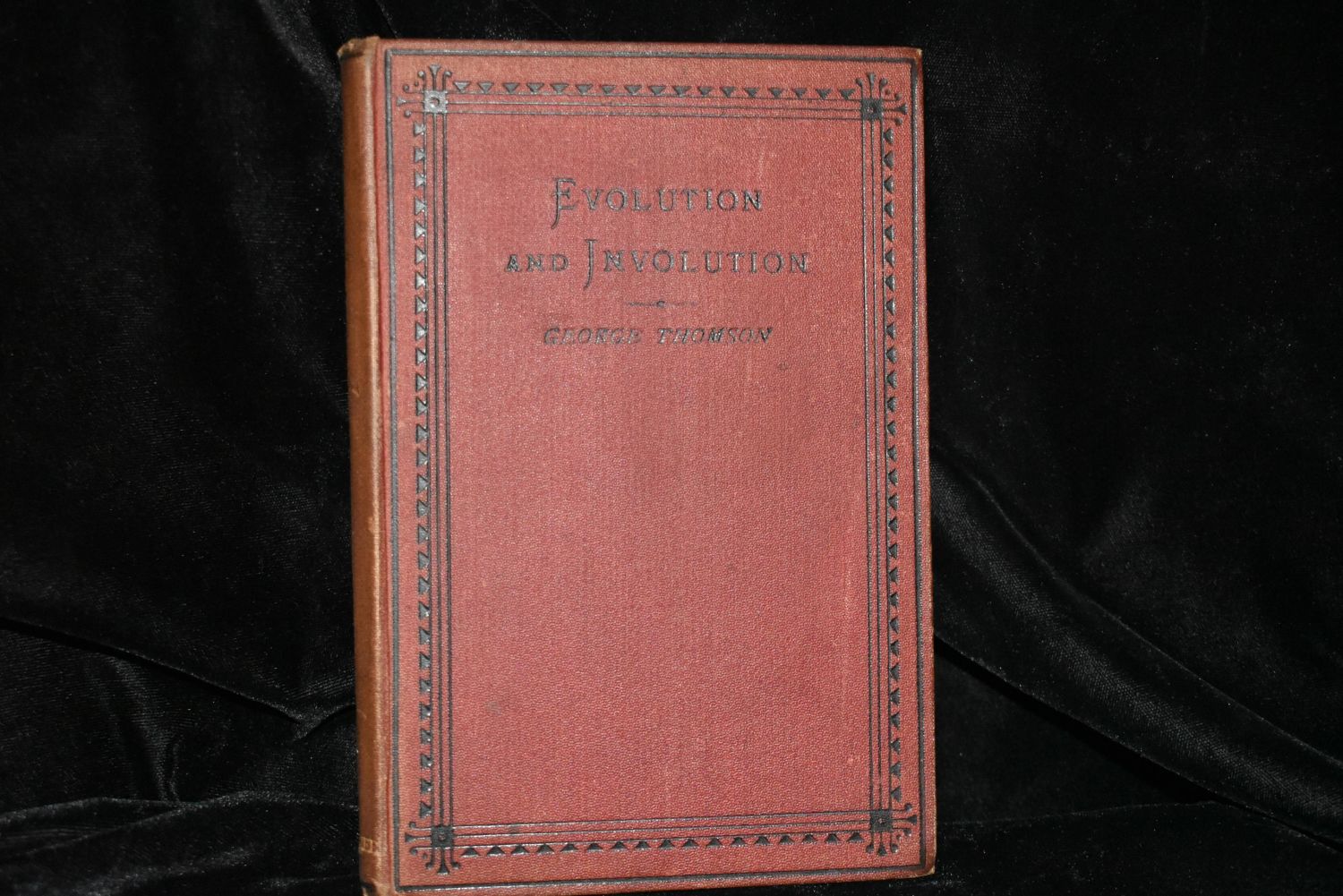 EVOLUTION and INVOLUTION 1880 by George Thomson. Published by London: Trubner and Co. 1880. 1st Edition VERY RARE. Publishers Red Cloth with black and gold gilt. Very Good Condition. Some fading to spine. 205pp 7 1/2" by 5 1/8"