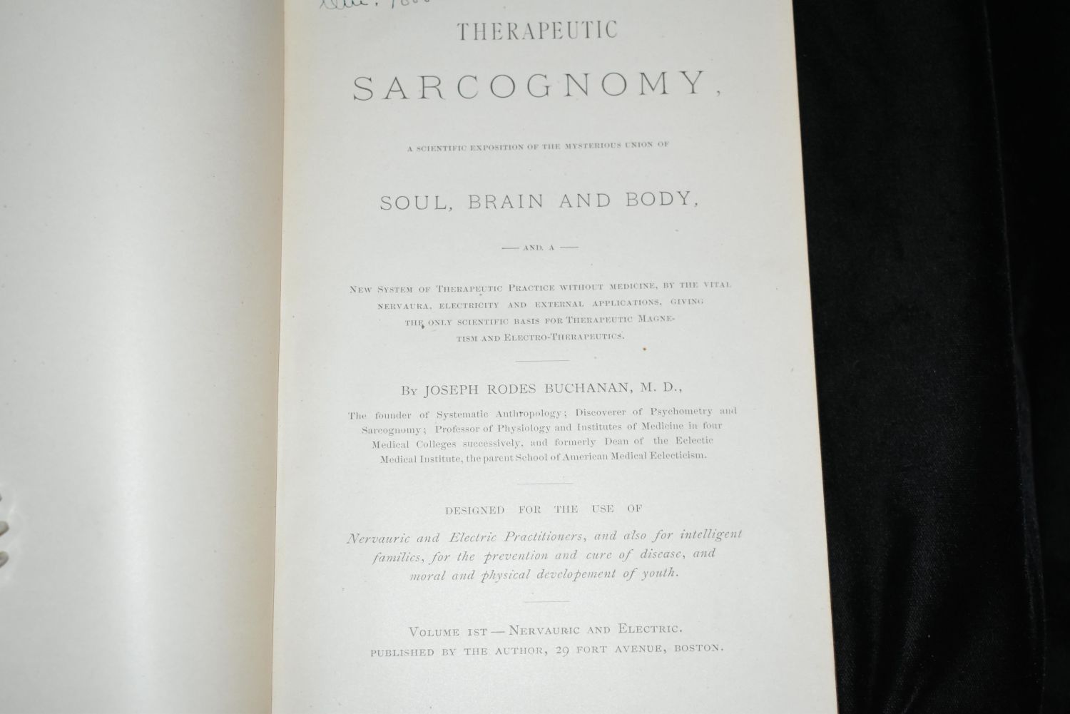 Therapeutic Sarcognomy Medical Book 1884 by Joseph Rodes Buchanan. Published by the author. A scientific exposition of the mysterious union of the soul, brain and body and a new system of therapeutic practice without medicine…..Therapeutic magnetism and electro-therapeutics. Publishers hardback black cloth with gilt. Good Condition with some shelf wear. 269 pgs 10 1/4" by 6 1/2"