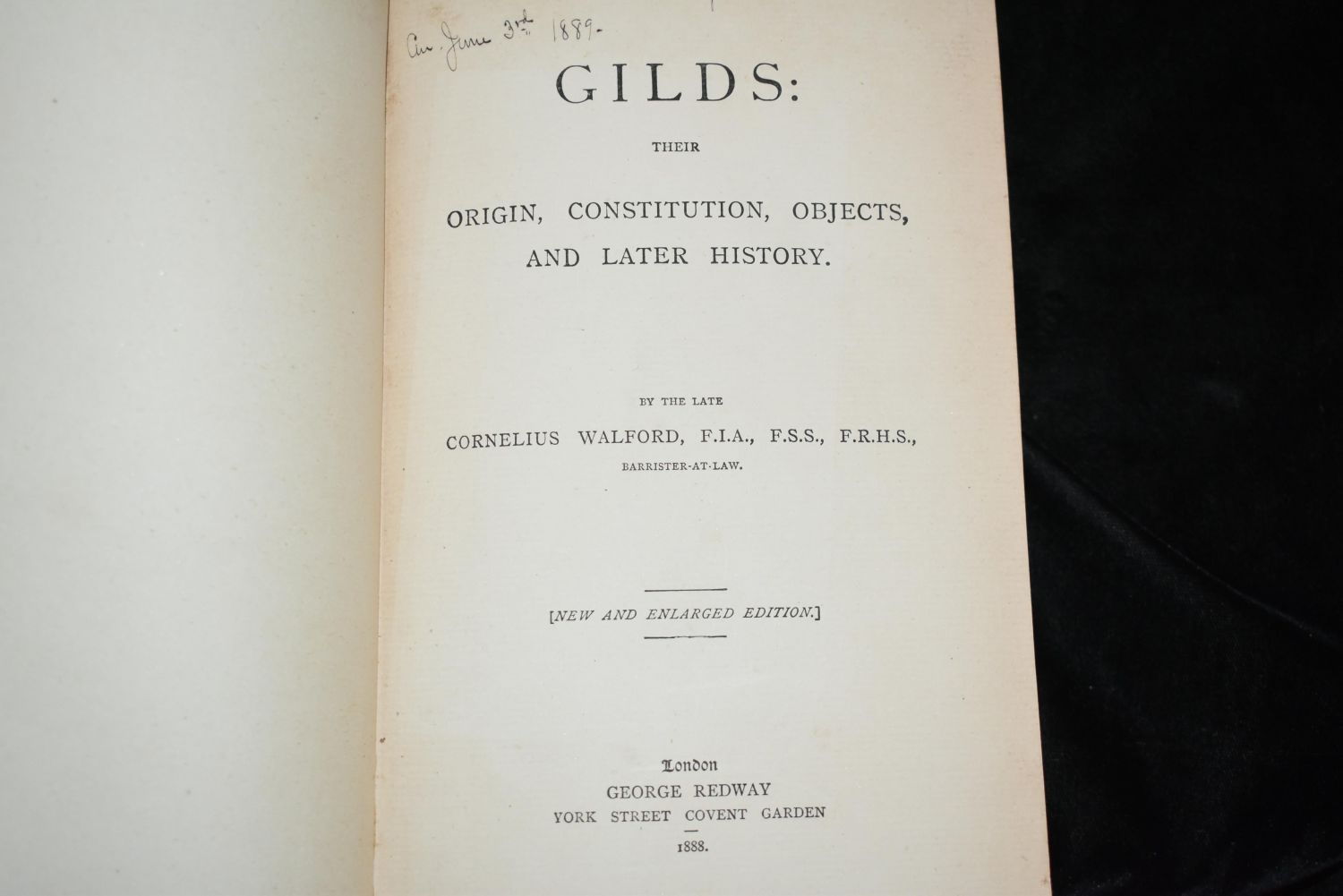GILDS: Their Origin, Constitution, Objects, and Later History by Cornelius Walford 1888. London: George Redway. Publishers original blue cloth with black ink embossing. Very Good Condition. 272 pgs 8 3/4" by 5 7/8"