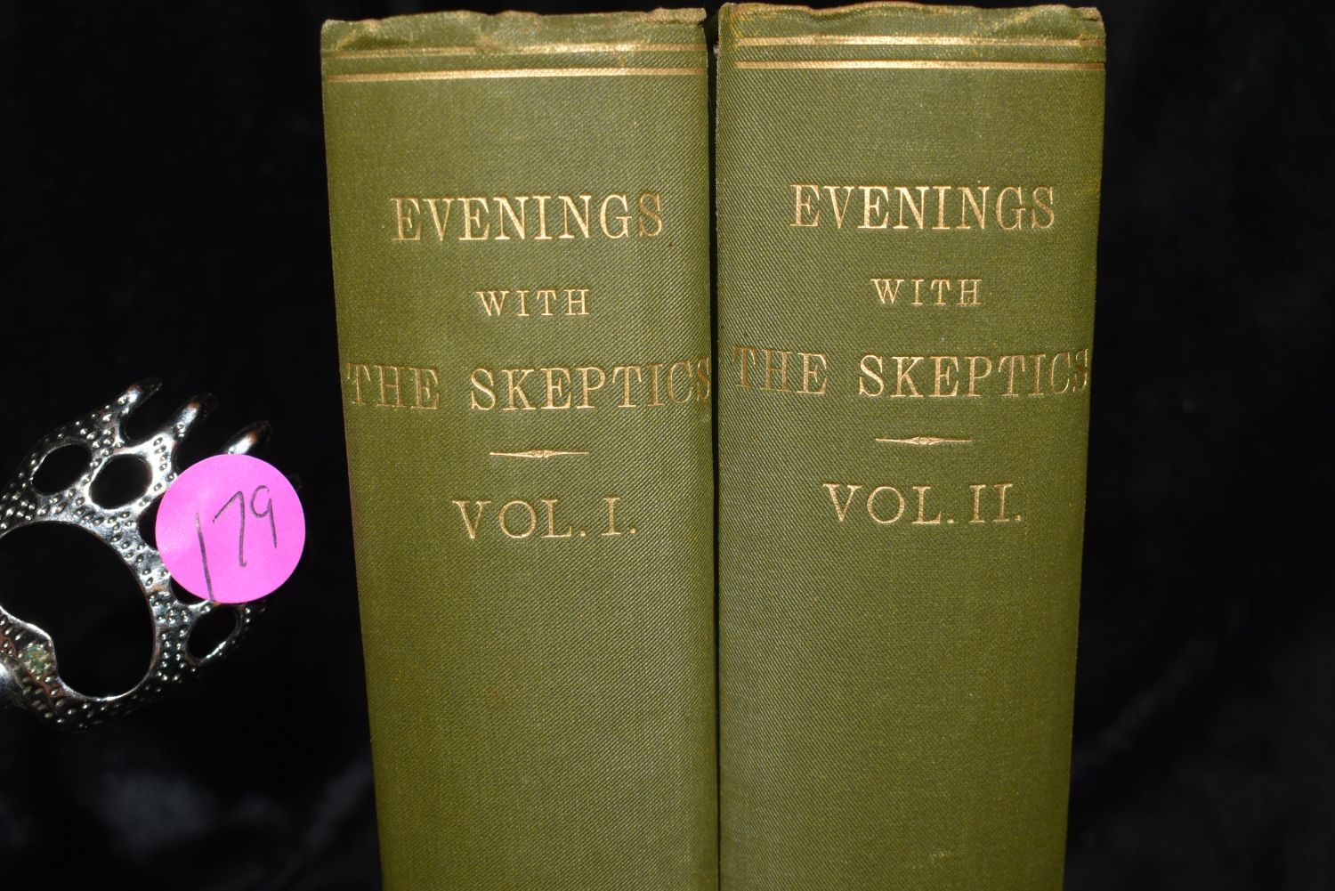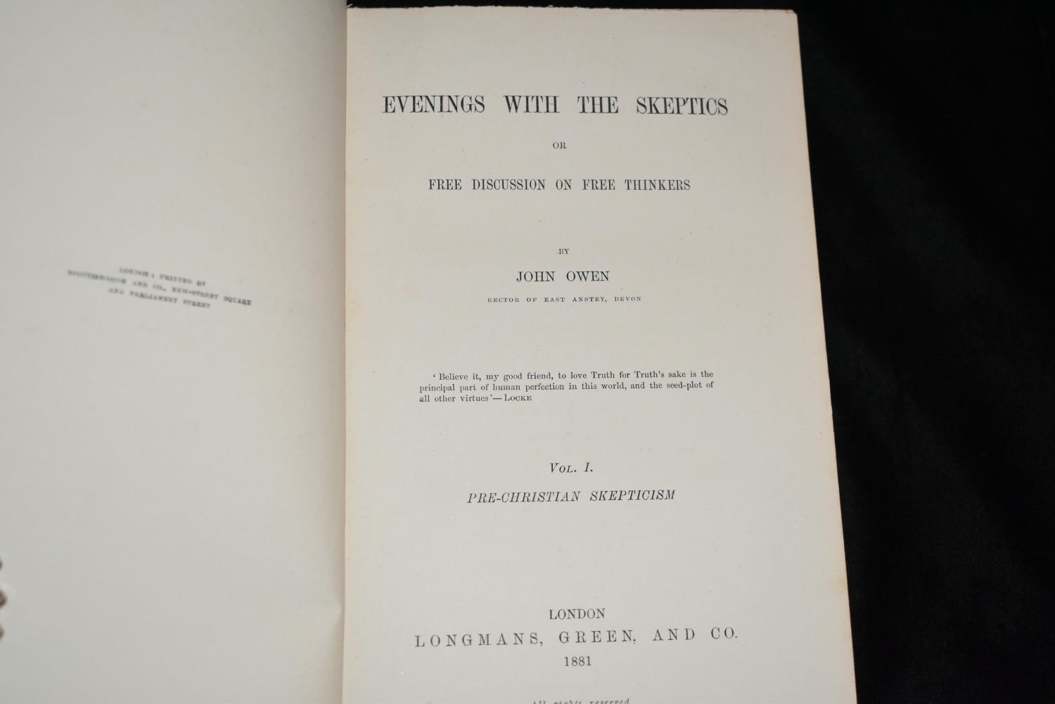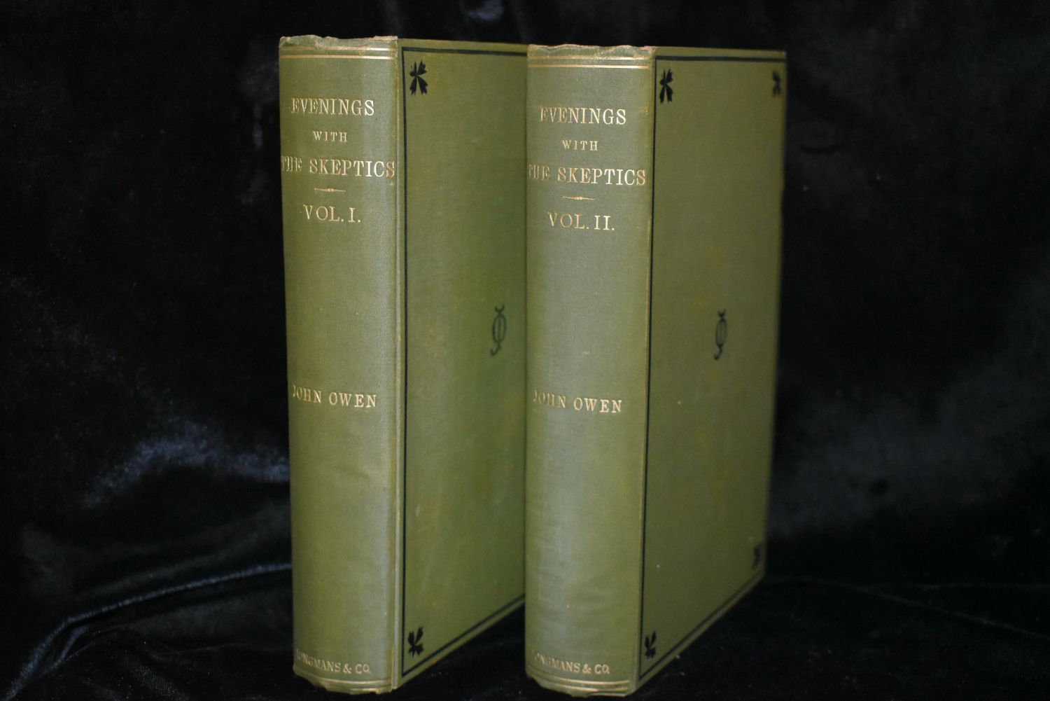 EVENINGS WITH THE SKEPTICS 1881 by John Owen. London: Longmans, Green and Co. 1881. 2 Volumes. Free Discussion on the free thinkers on pre-Christian skepticism and vol 2 is on Christian skepticism. Very Good Condition. Publishers Hardback Original Green Cloth with black embossing and gold gilt. 464 pgs and 5 16 pgs. 9" by 6"