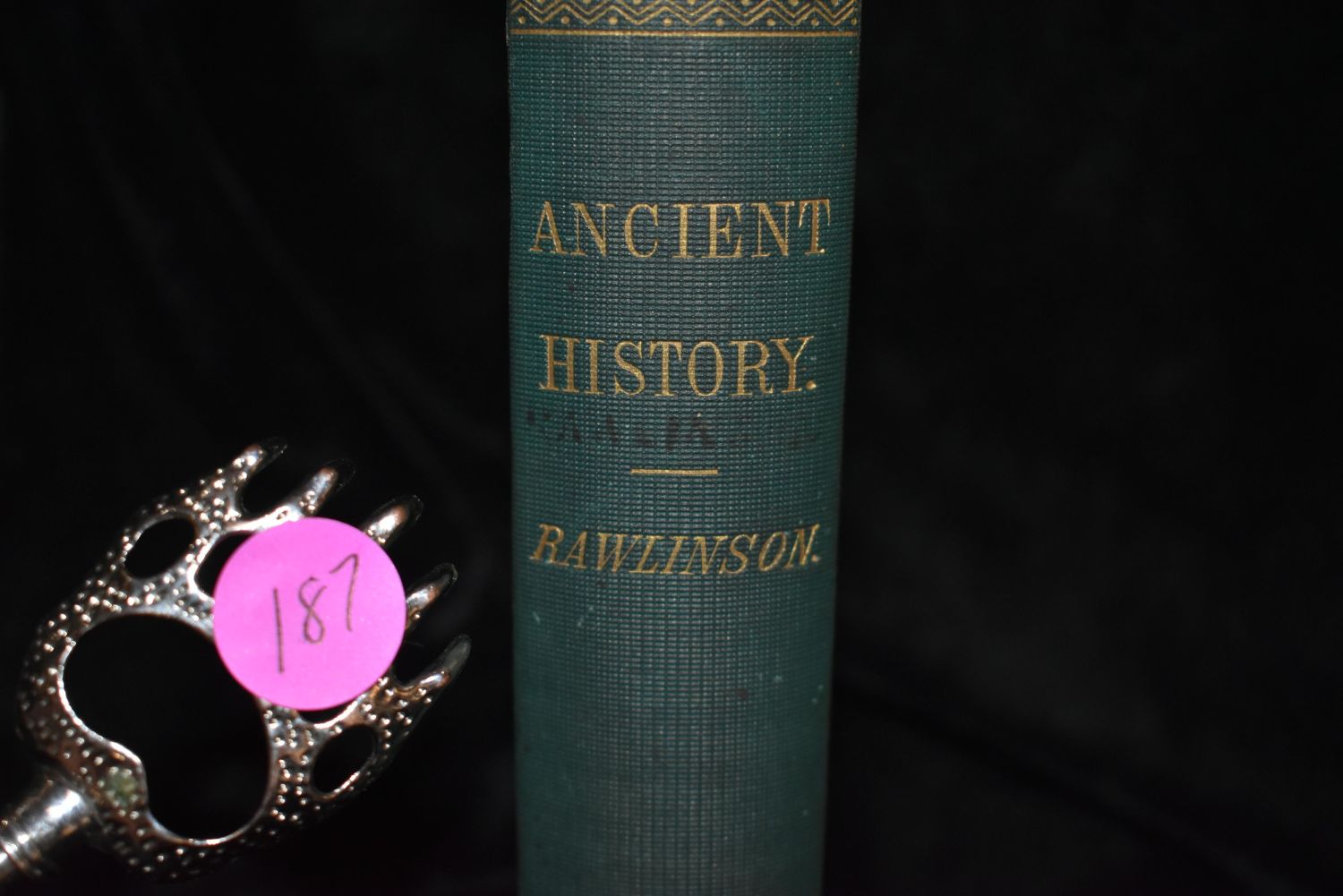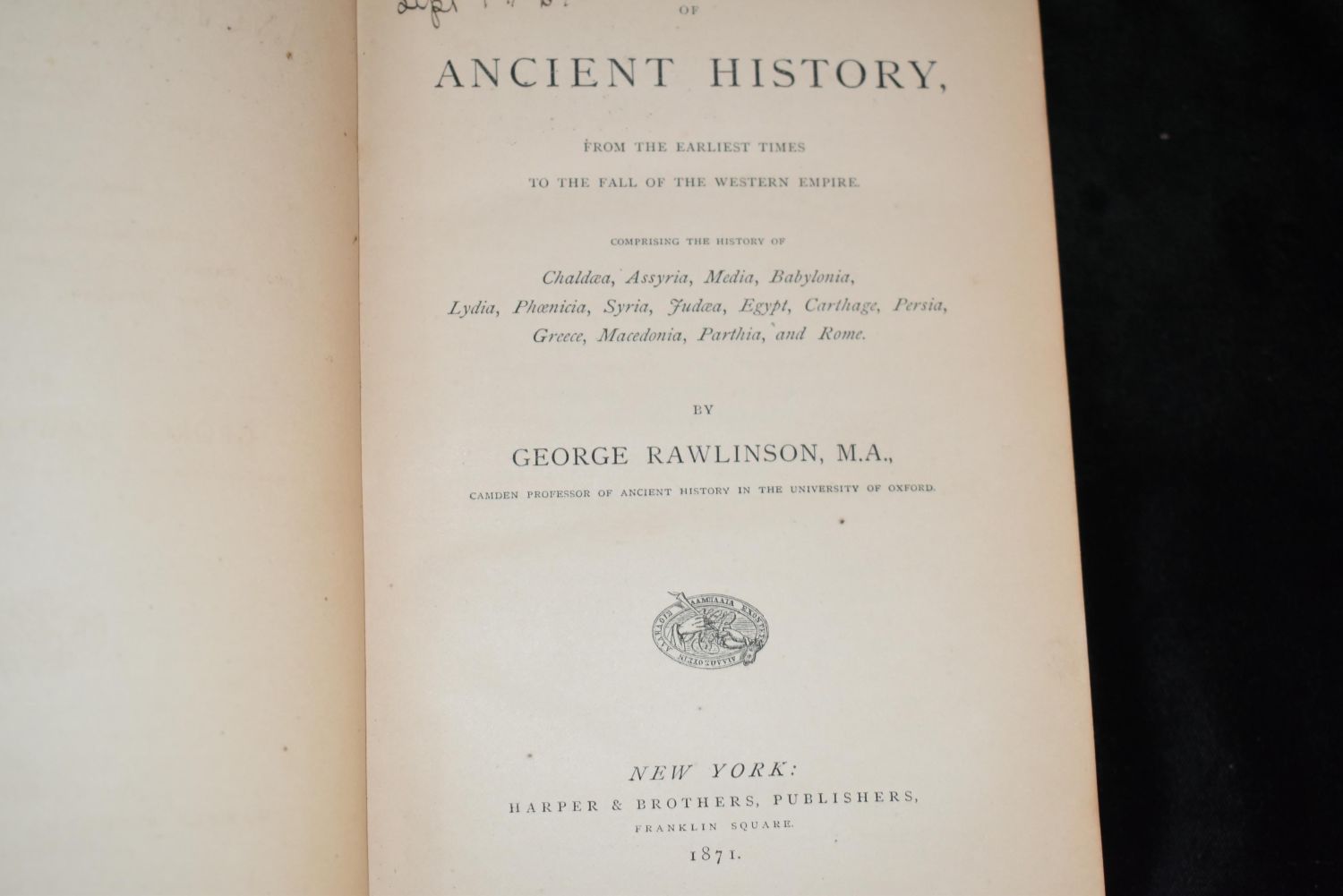 A Manual of Ancient History From the Earliest Times to the Fall of the Western Empire [Hardcover] by George Rawlinson. Harper and Brothers publishers 1st Edition 1871. Condition Very Good. Green cloth boards with gold spine title; cover has a little wear; no jacket. Owner signed inside; 633 pages; 7 3/4" to 9 3/4" tall.