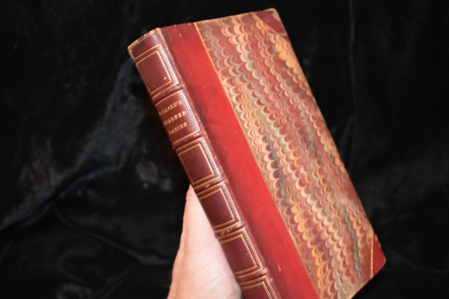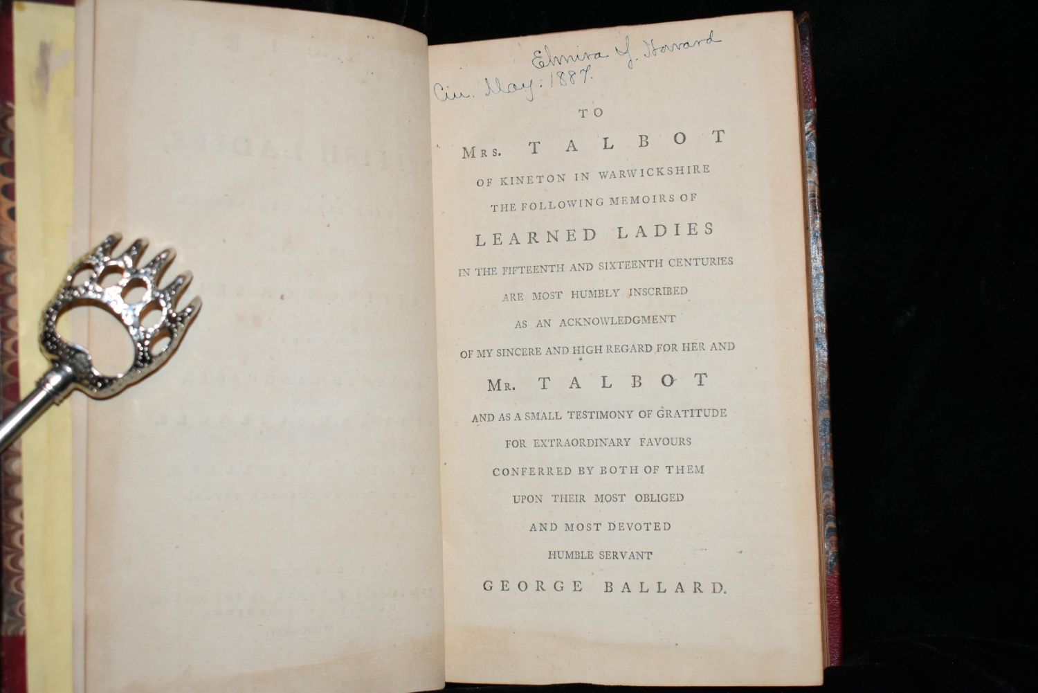 1775 MEMOIRS OF BALLARD’S LEARNED LADIES by George Ballard. London: Printed For T. Evans, in the Strand, Near York Buildings. Memoirs of Several Ladies of Great Britain, who have been celebrated for their writings or skill in the learned languages arts and sciences. Very Good Condition for its age. Half Leather with colorful boards and gold gilt. Some Shelf Wear to corners and boards. Very little spotting or foxing internally. 320 pages plus an index. 8 1/4" by 5 1/4"