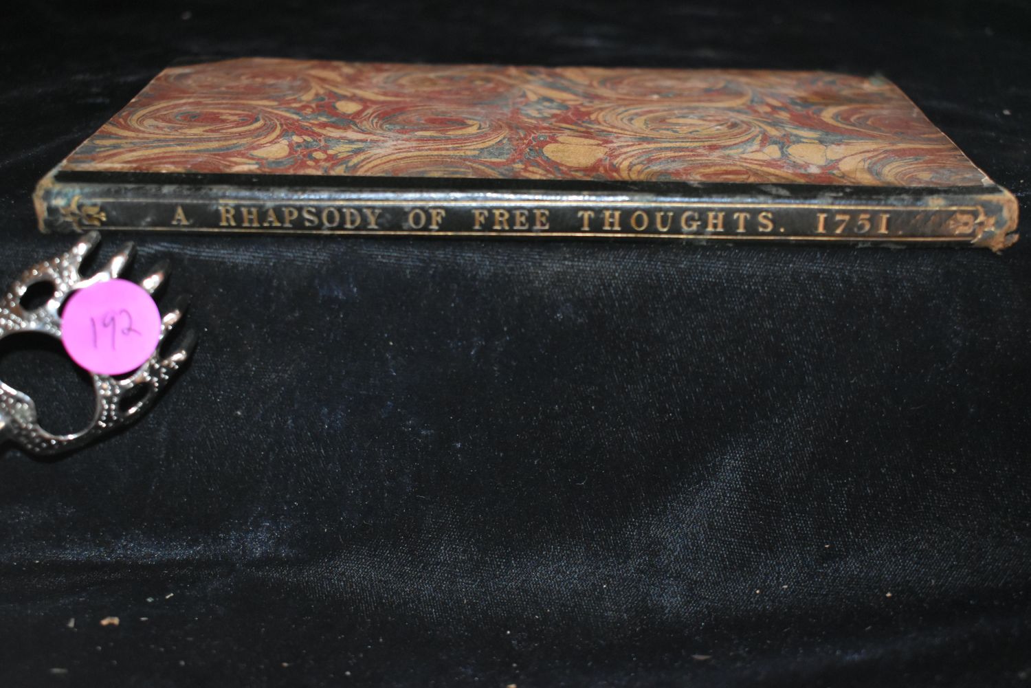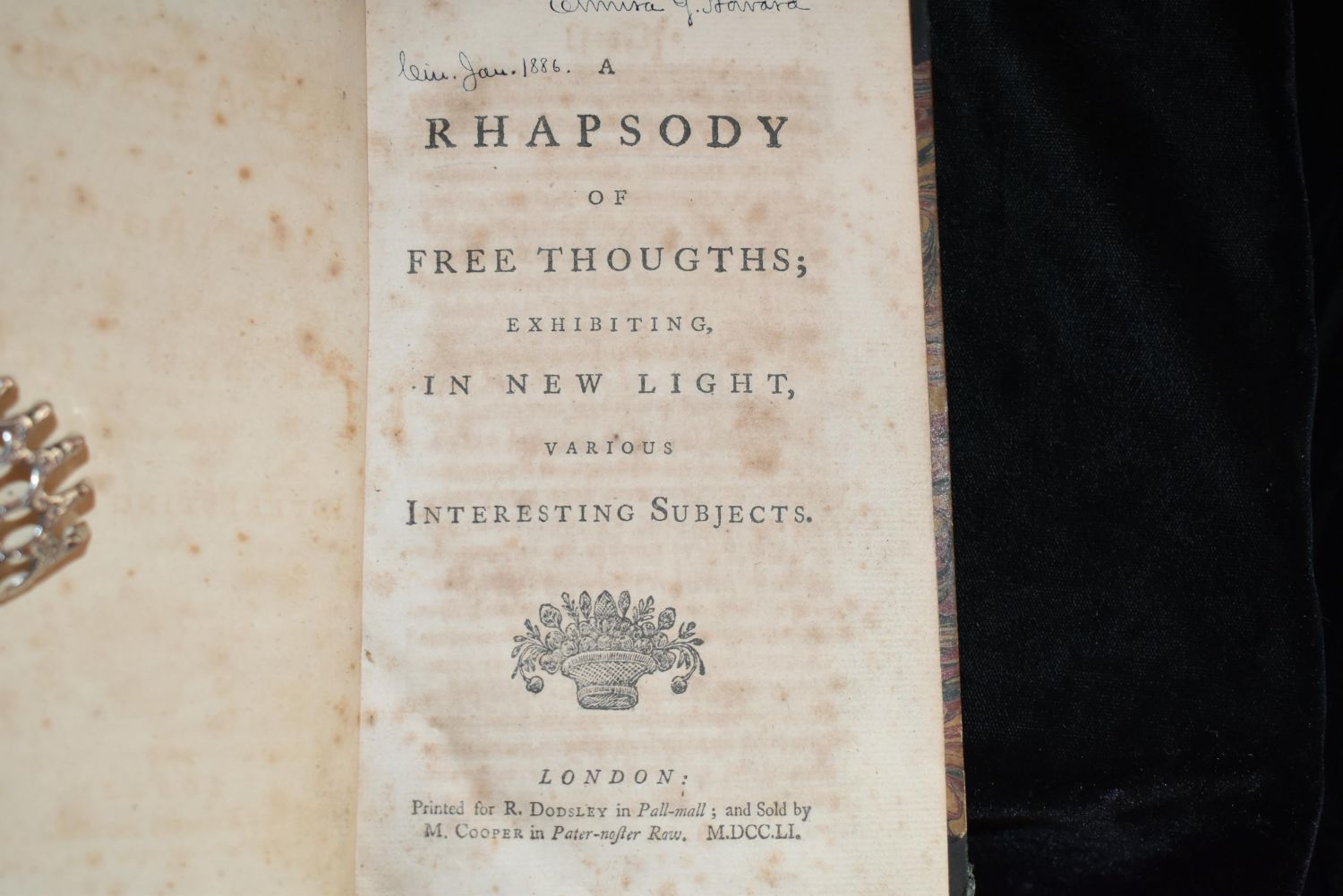 A Rhapsody of Free Thoughts: Exhibiting, in New Light, Various Interesting Subjects. Printed by R. Dodsley in Pall-Mall and sold by M. Cooper in Pater-nofter Raw. VERY RARE 1751 1st Edition. Very Good Condition for its age. Some corner rubbing and foxing on the pages. Owner signed inside. A pencil marking here and there on a few pages.