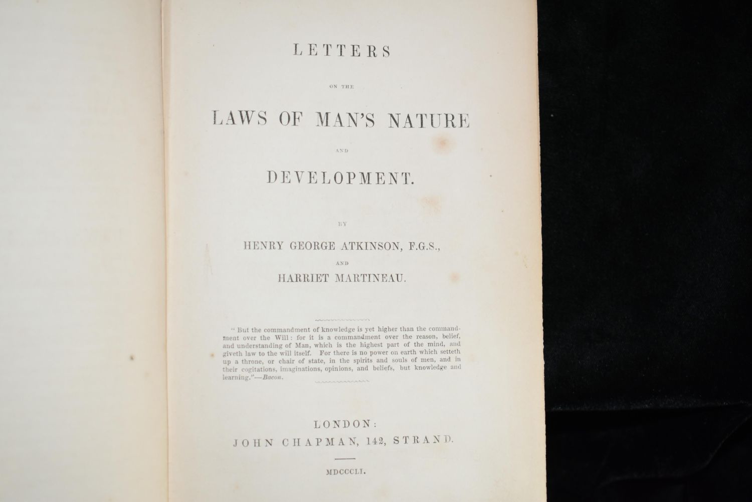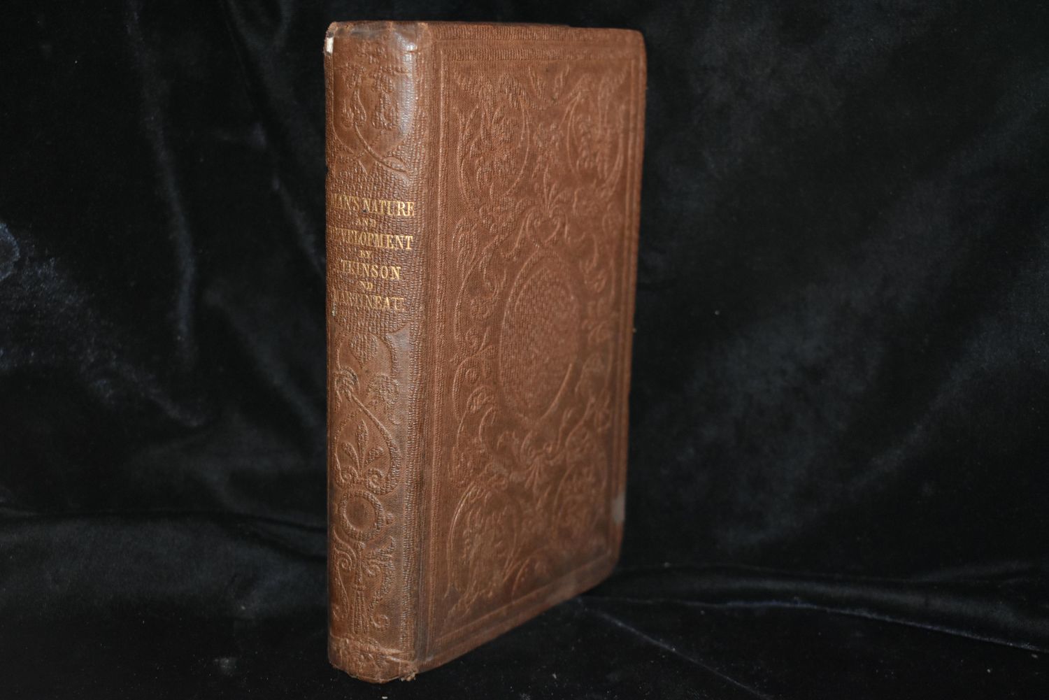 LETTERS ON THE LAWS OF MAN’S NATURE AND DEVELOPMENT Atkinson, Henry George & Martineau, Harriet Published by Josiah P. Mendum, Boston (1851) First Edition. Hardbound. 396 pages. Original brown blind-stamped cloth with gilt lettering on the spine. Minor rubbing to corners and top of spine with a couple of penciled in writings on 2 pages. Size: over 6¾" – 7¾" tall.