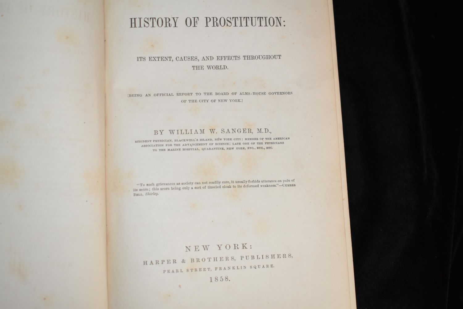 The History of Prostitution, its Extent, Causes, and Effects throughout the World. Being an Official Report to the Board of Alms-House Governors of the City of New York by SANGER, William W. Hardcover. Condition: Good. New York, Harper and Brothers, 1858 1st Edition. Large octavo, 686 pgs. Original blind-stamped brown cloth with shelf wear on the corners and slightly chipped at the ends of the spine; edges a little dusty, occasional light foxing and owner signature inside.