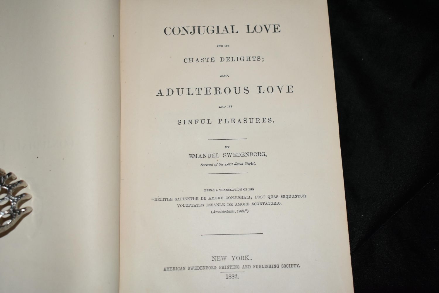 Conjugal Love and It’s Chaste Delights; Also, Adulterous Love and It’s Sinful Pleasures by Swedenborg, Emanuel. American Swedenborg Printing & Publishing Society, NY, 1882. Hardcover. Condition: Very Good Bound in brown blind stamped cloth with gold spine lettering. 472pp. 9" by 5 3/4" Included The Apocalypse Revealed by Swedenborg 1881. Its covers are a bit loose but otherwise in good shape.
