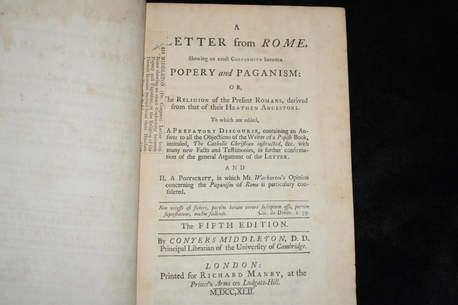 A Letter from Rome, Shewing an Exact Conformity Between Popery and Paganism: Or, the Religion of the Present Romans, Derived from That of Their Heathen Ancestors. Printed for Richard Mansby, at the Prince’s arms on Lutgate-Hill Very Rare 1742. condition is Fair. Pages are in Good Shape but the Front Cover is separated. Hardback Leather with Gold Gilt. 8" by 5"