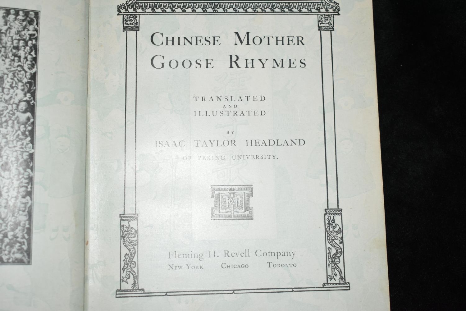 Chinese Mother Goose Rhymes. Translated and Illustrated by Isaac Headland Taylor of Peking University Headland, Isaac Taylor, Fleming H Revell Company, New York 1900. 1st Edition. Hardcover. Collectible. First Edition. All corners and extremities worn & bumped, some soil on endpapers & owner names on title page. 9 1/4" by 7 3/4"