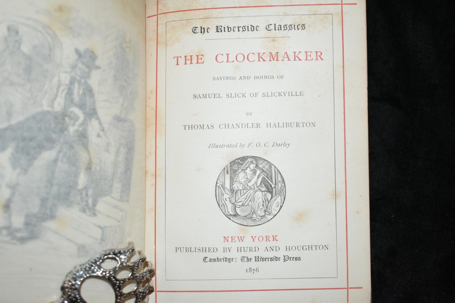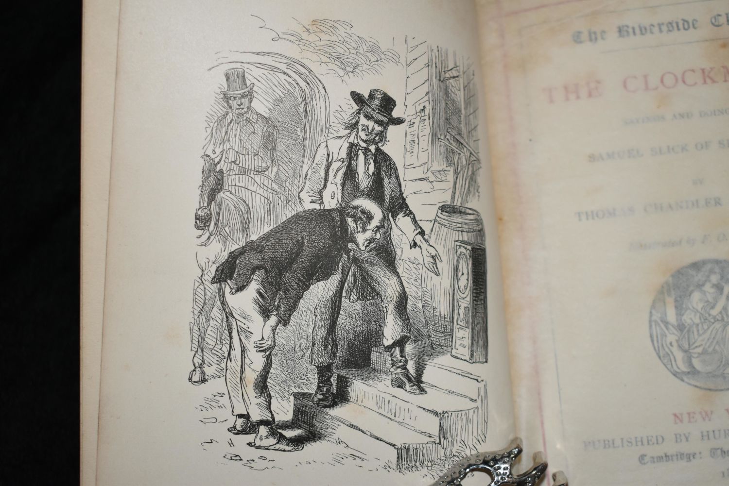The Clockmaker: Sayings and Doings of Samuel Slick of Slickville by Thomas Chandler Haliburton, Published by Hurd and Houghton, New York 1872. Hardcover. Condition: Very Good. F.O.C. Darley (illustrator). Reprint Edition. New York: Hurd and Houghton, 1872. Popular in England and America, the politician T.C. Haliburton (1796-1865) became Canada’s first international best-selling author with his comic character Sam Slick, who first appeared in a newspaper in 1835. This is a Very Good (Plus) copy of a reprint edition, part of the "Riverside Classics." Green decorative cloth binding, with gilt titling on both front cover and spine. Clean text; xi, 271 pages, with sixteen pages of publisher’s adverts in the rear. Mildly bumped, with rubbing to spine margins. The gilt remains bright and clear. Reprint Edition. Decorative Cloth. Very Good 6 5/8" by 5"
