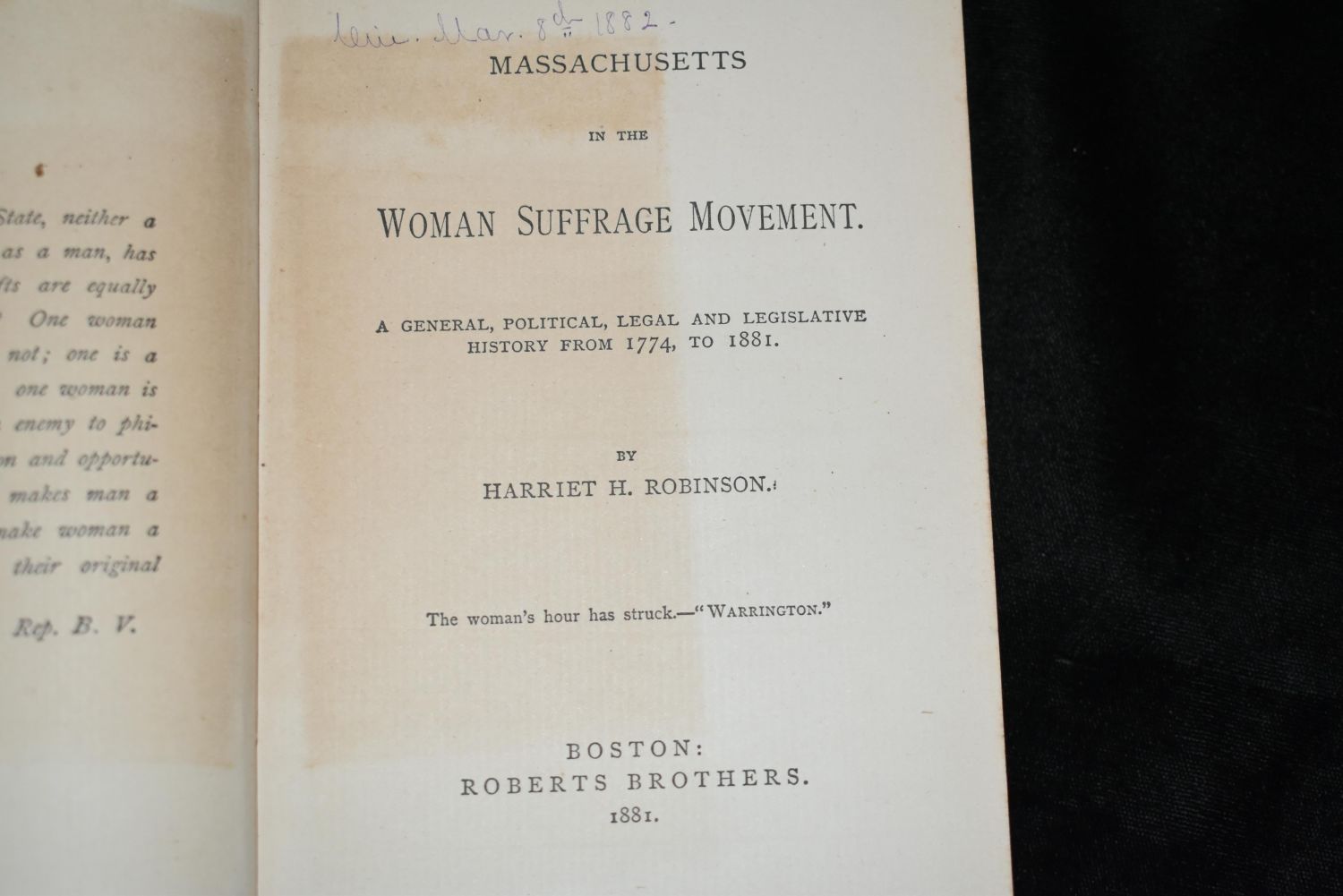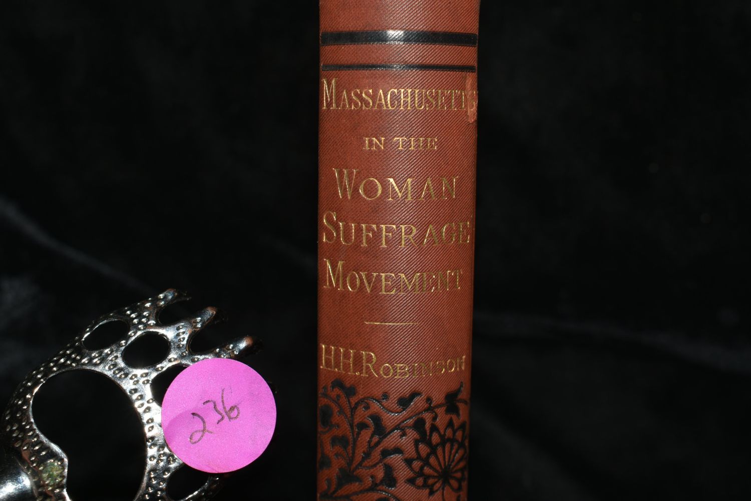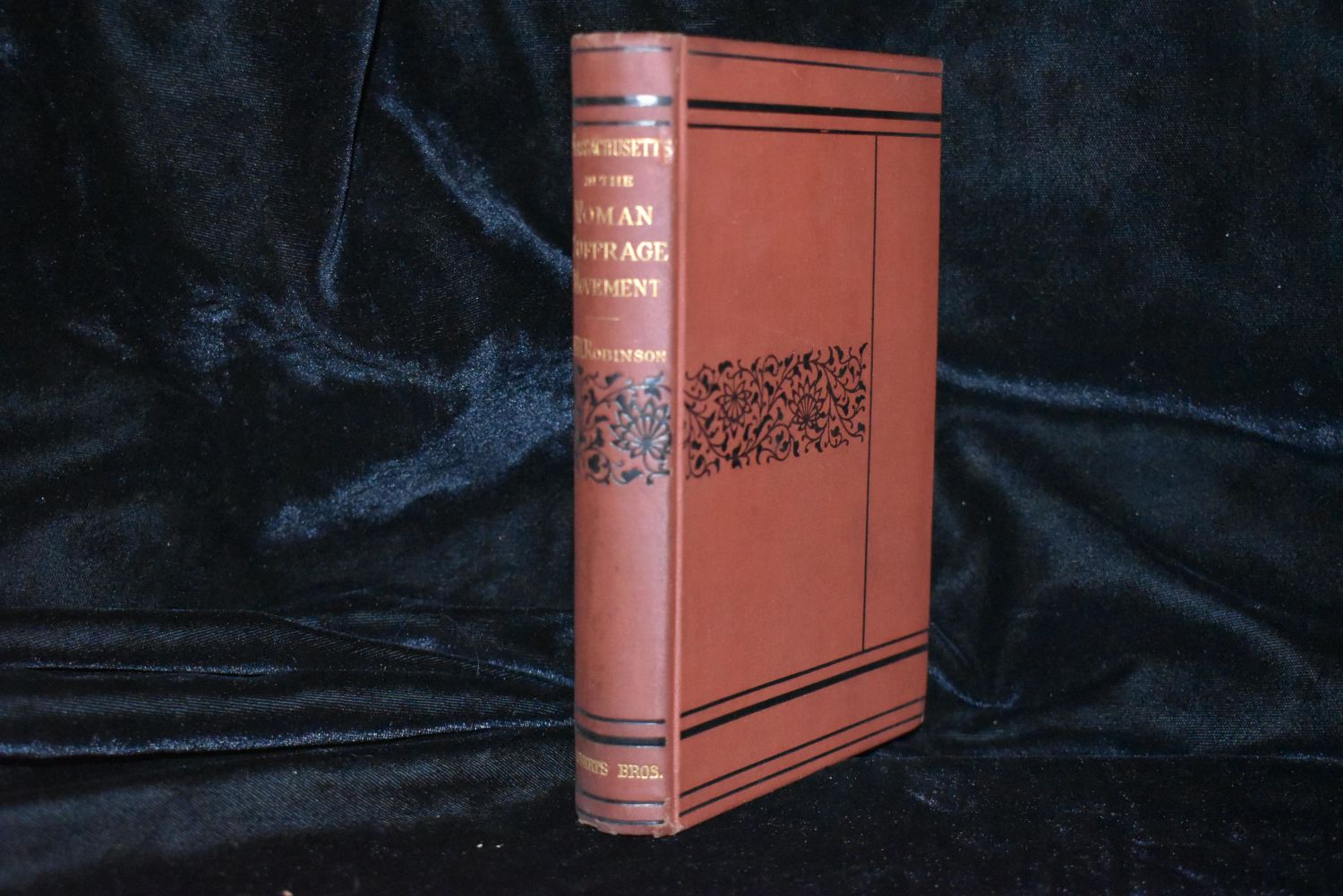 MASSACHUSETTS IN THE WOMAN SUFFRAGE MOVEMENT. A GENERAL, POLITICAL, LEGAL AND LEGISLATIVE HISTORY FROM 1774 TO 1881 by Harriet H. Robinson. Published by Boston: Roberts Brothers 1881. 1st Edition. Hardback Red Cloth with black and gold gilt. Condition: Very Good. Owner’s name written on the title page with an old newspaper clipping that was used for a bookmark that darkened that page where the book mark sat for over a hundred years. 7" by 4 3/8"