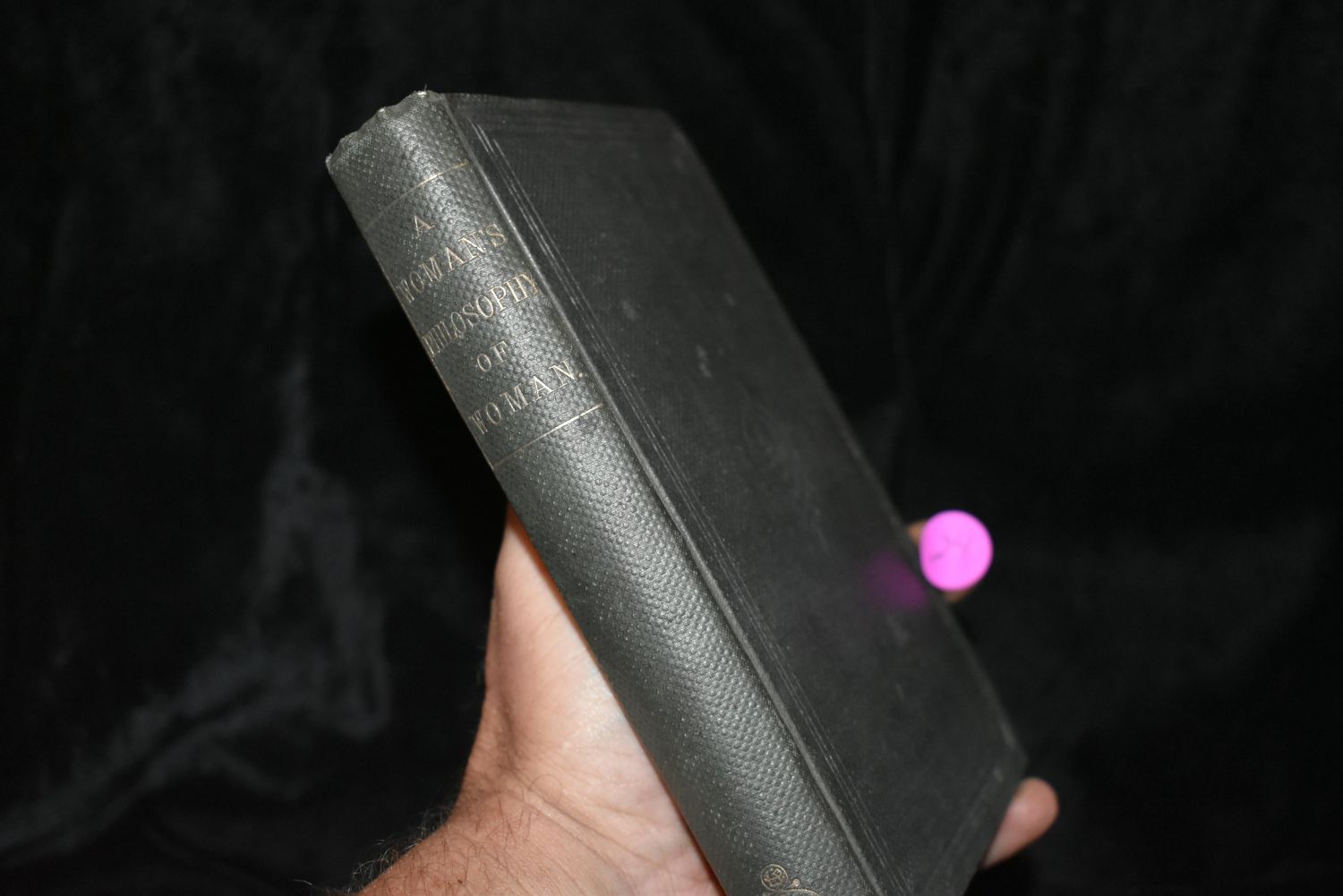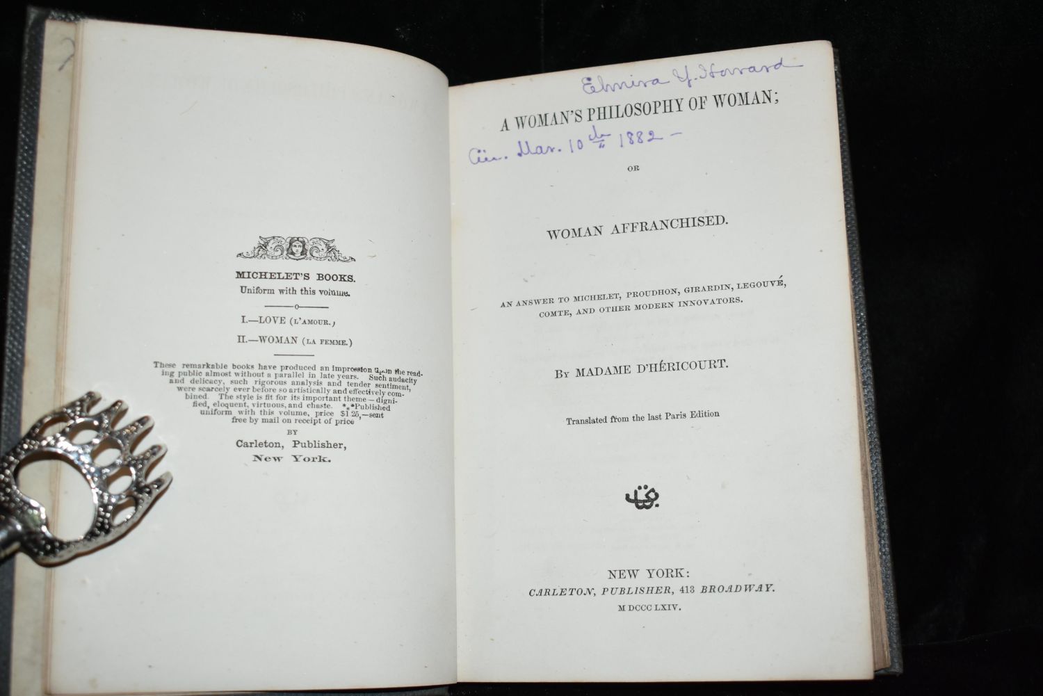 A WOMAN’s PHILOSOPHY OF WOMAN; or WOMAN AFFRANCHISED by Madame Dhericourt. Published by Carleton 1864. 1st Edition. Publishers Hardback Victorian Era Embossed Black CLoth with Gold Gilt. Very Good Condition with minor foxing to a few pages. 317 pages 7 1/2" by 5"