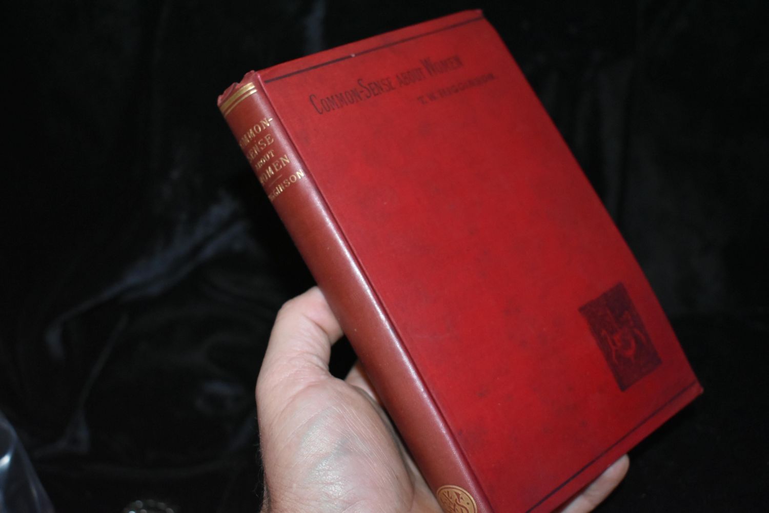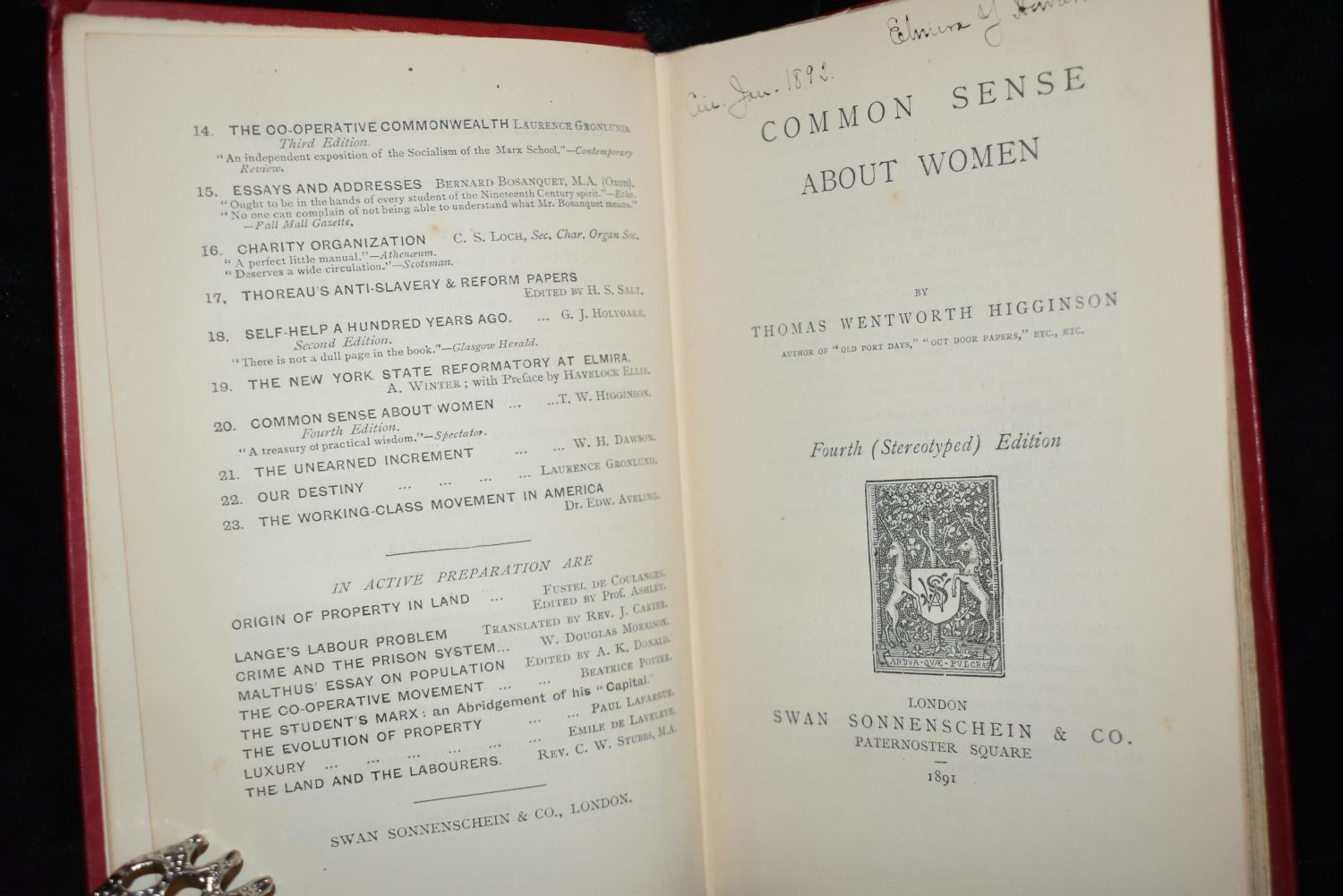 1891 COMMON SENSE ABOUT WOMEN by T. W. Higginson. Published by Swan Sonnenschein and Co. 1891. 4th Edition. Publisher’s Hardback Red Cloth With Victorian Era Black Gilt on front Cover with Gold Gilt on the Spine. Very Good Condition for its age. 270 pgs 7 5/8" by 5 3/8"