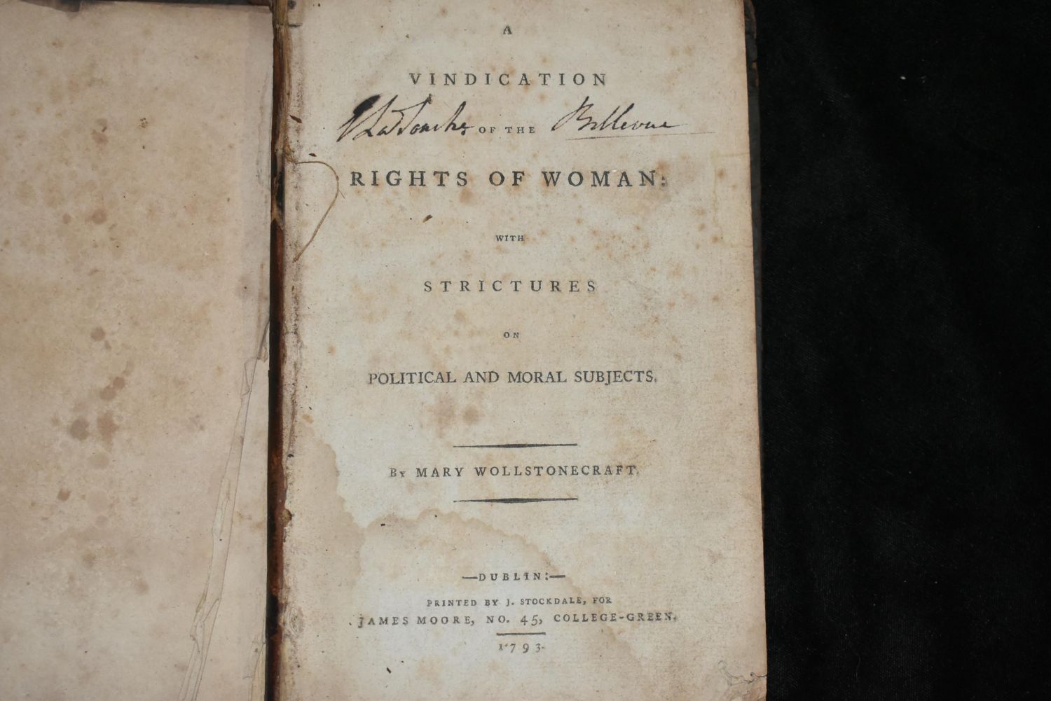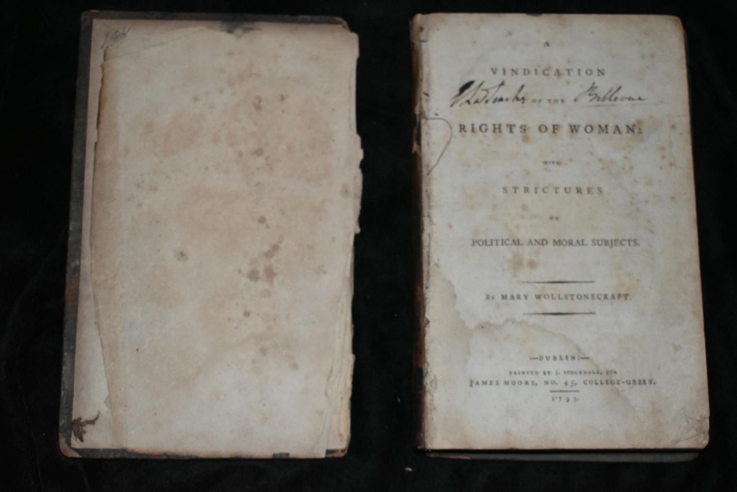 A Vindication of the Rights of Woman (1793) by Mary Wollstonecraft, printed by J. Stockdale for James Moore. One of the earliest works of feminist philosophy. Hardback/Leather. Book Condition Collectible. Cover and 1st Page are separated, Leather is wore and aged on the spine. Pages have foxing with a small tare here and there but are all there and readable. Book is still all there but needs some TLC. 8 1/2" by 5 1/2"