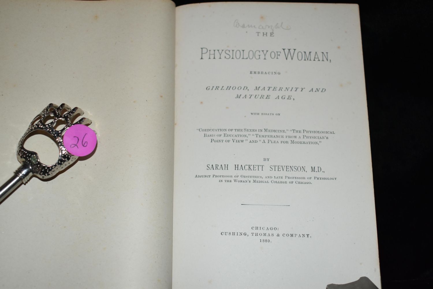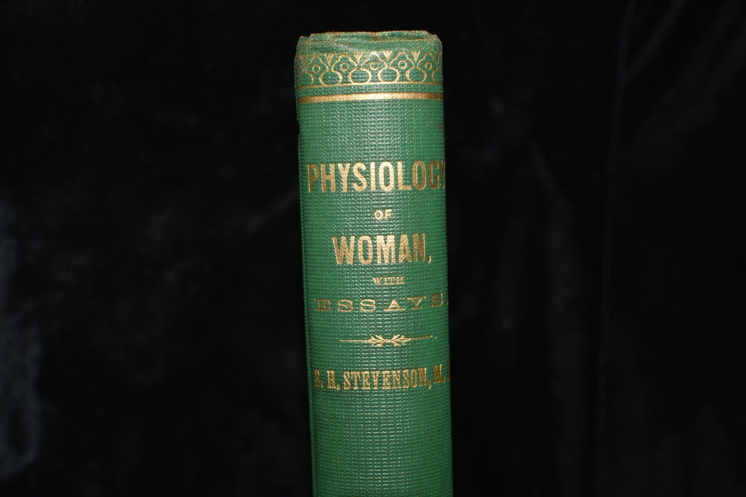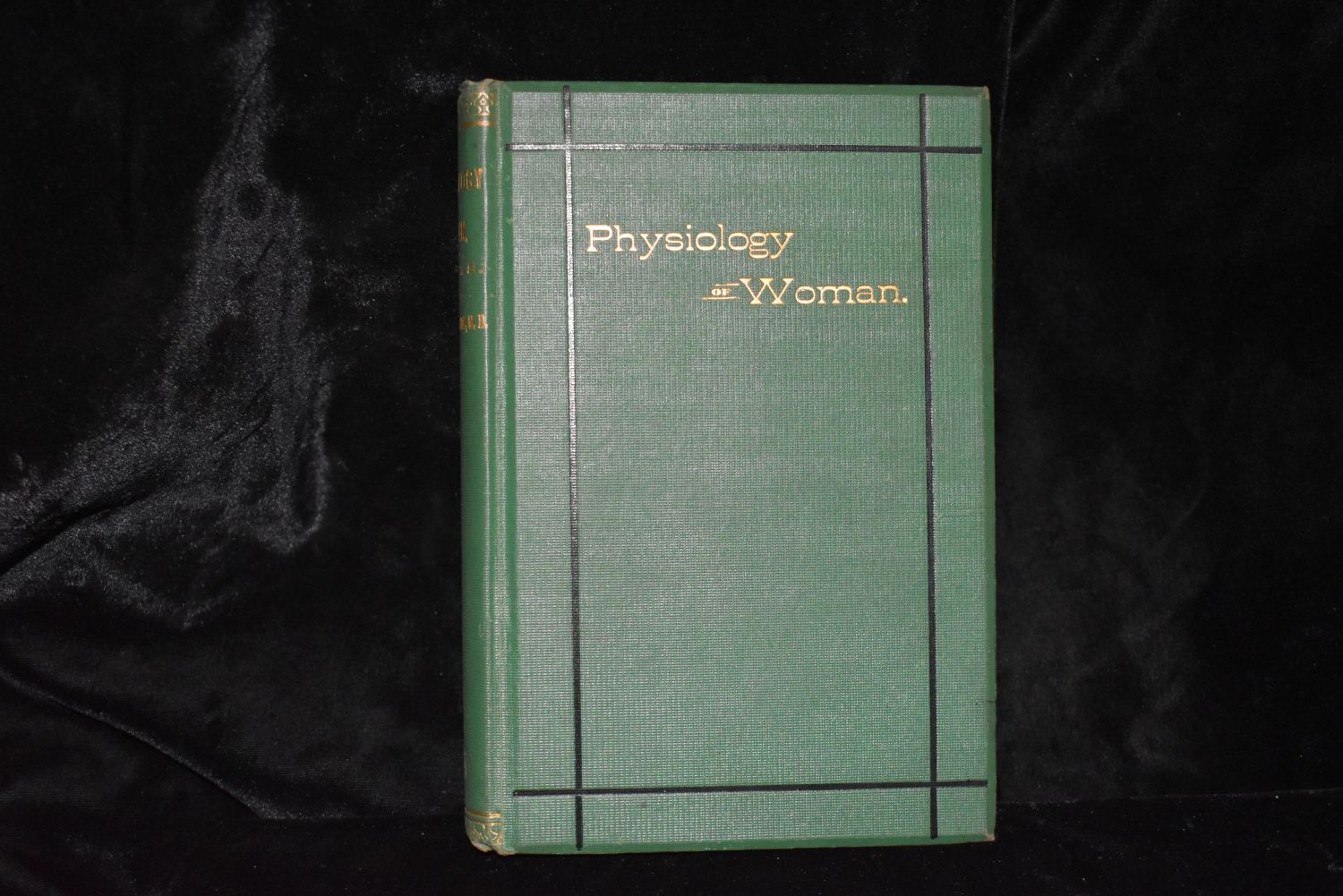 1880 THE PHYSIOLOGY OF WOMAN, EMBRACING GIRLHOOD, MATERNITY AND MATURE AGE by Sarah Hechett Stevenson. Published by Cushing, Thomas & Company 1880. Presumed 1st Edition. Publishers Victorian Era Hardback Green Cloth with Black and Gold Gilt. Very Good Condition with minor shelf wear. 230 pgs 7 5/7" by 5 1/4"