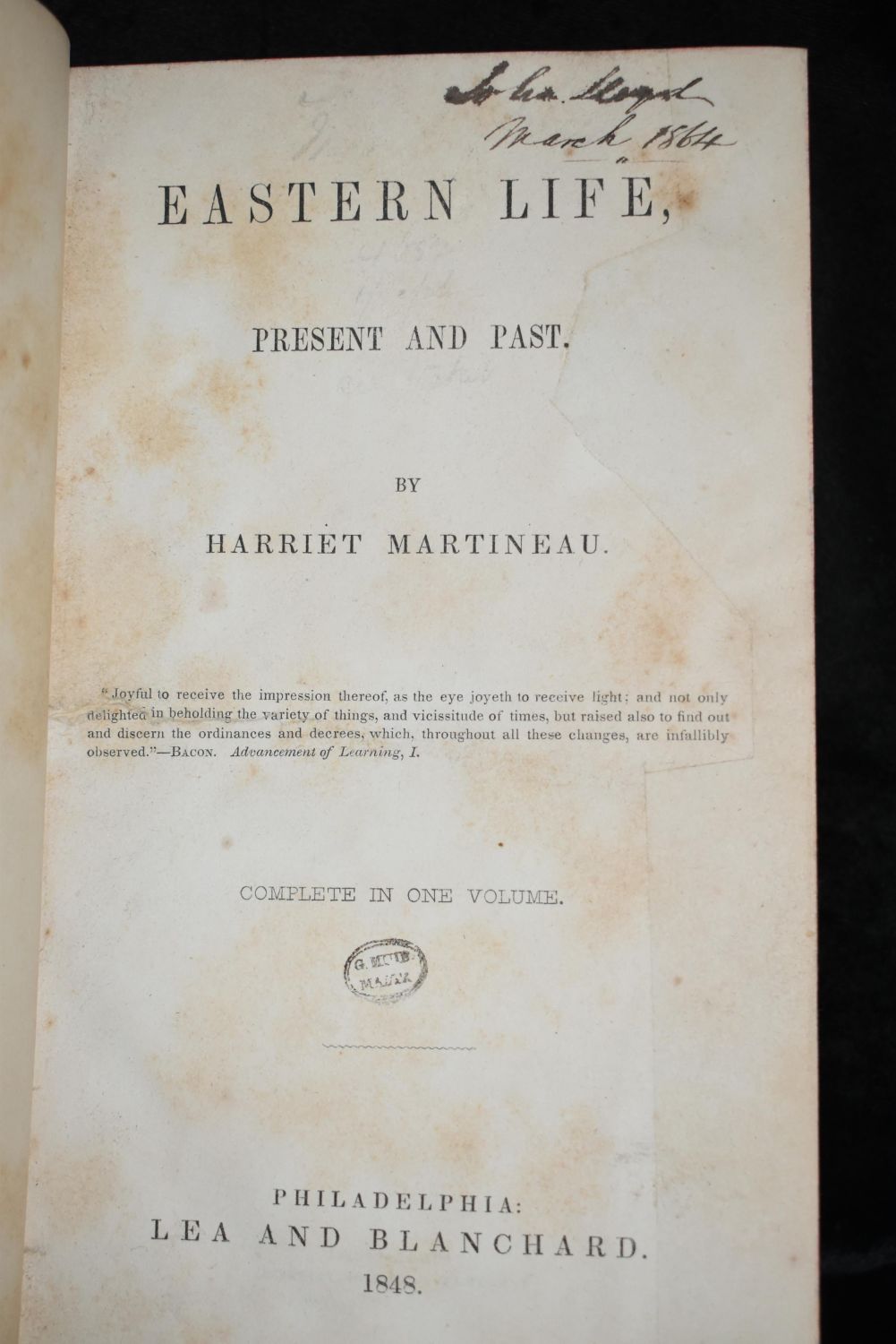 Eastern Life Present and Past 1848 by Martineau, Harriet. Published by Lea & Blanchard, Philadelphia (1848). (Complete in one Volume) Better than Good Condition for its age. Hardback Leather with gold gilt. Has shelf and use wear to corners and edges. Part of the label is missing from the spine. Pages are mostly clean with some foxing or thumbing. 8 1/8" by 5 1/4"