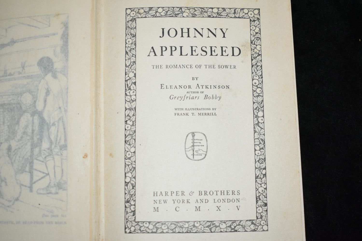 Johnny Appleseed (1915) Romance of a Sower Eleanor Atkinson Published by Harper & Bros, New York (1915). 1st Edition Hardback Green Cloth with Blue Print and Gold Gilt. Overall Good Condition. Has worn spot on the spine, otherwise solid book. 71/2" by 5"