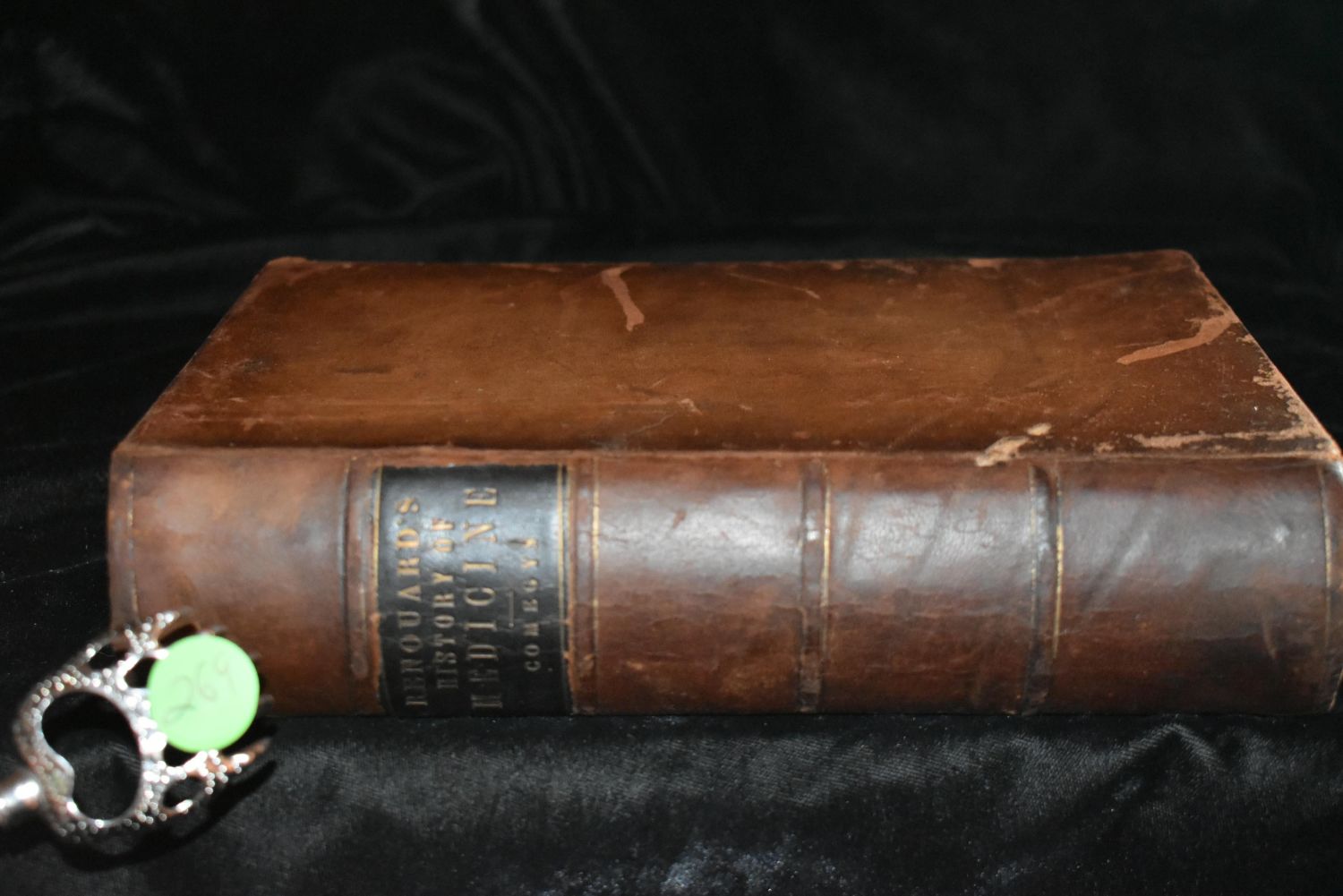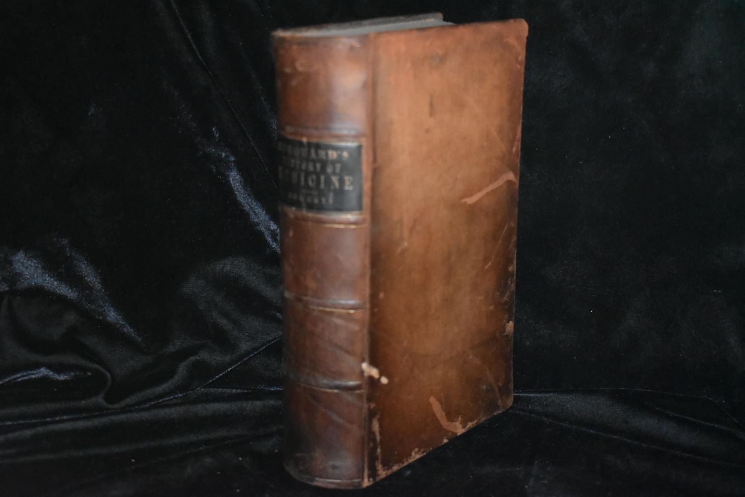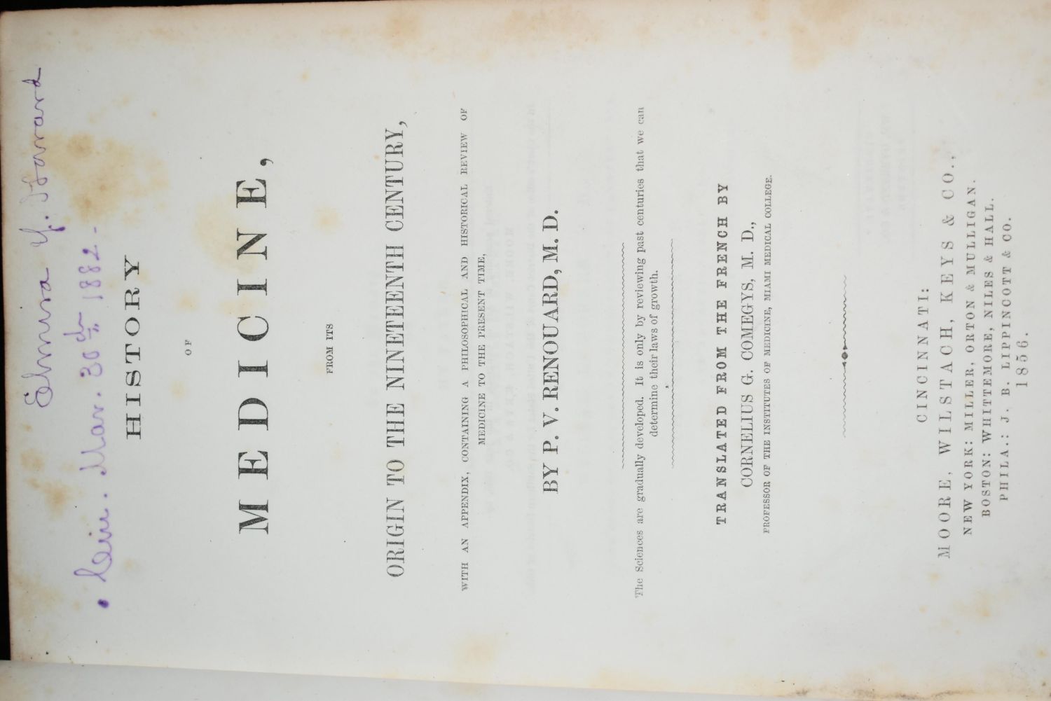 History of Medicine (1856) from its Origin to the Nineteenth Century by P. V. Renouard, M. D.. Published by Moore, Wilstach, Keys and Co. 1856. Translated from the french by Cornelius G. Comegys, M. D.. Hardback Leather in good shape for its age. Use and Shelf wear to cover. Foxing on some pages. Inside of back cover is a lot of medical stuff written in by its owner in the 1800’s. 9 1/2" by 6 1/2" by 2 1/8" 719 pages.