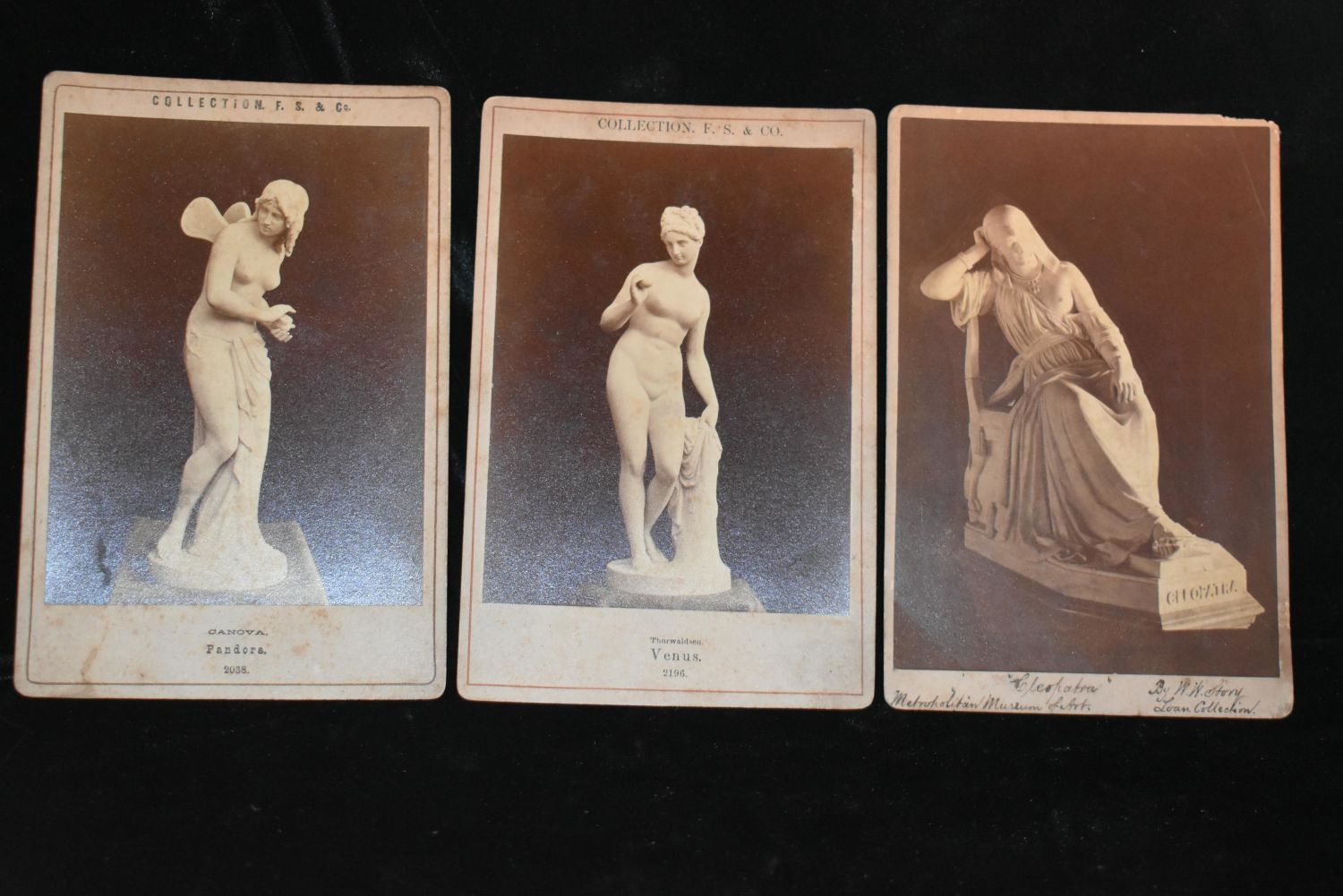 Pandora, Cleopatra & Venus 1800’s Cards. 3 cdv style cards from the late 1800’s published by F. S. & Co. Cleopatra, Venus and Pandora. 6 1/2" by 4 1/4" Age spots with very minor corner wear.