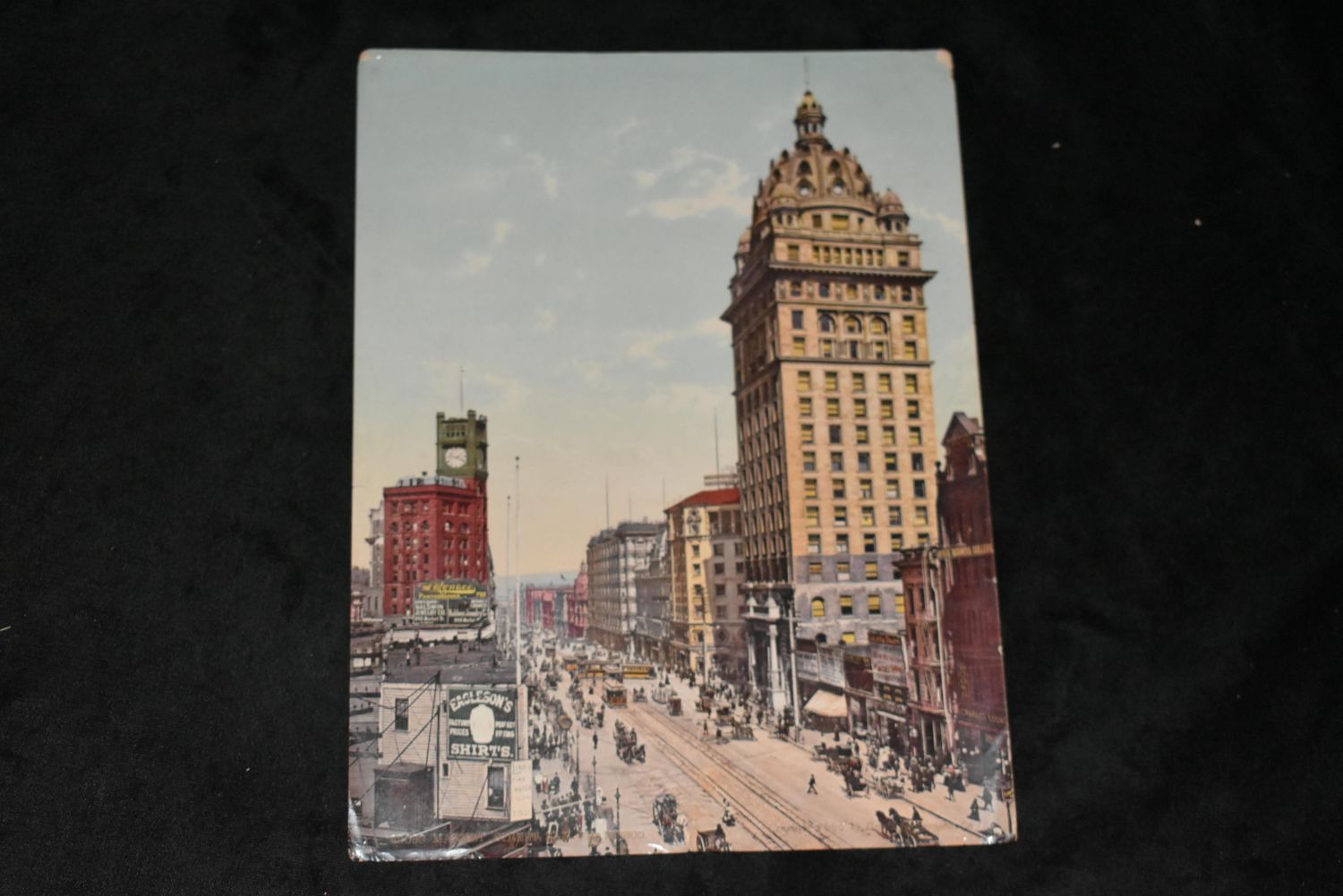Early Color Photograph of San Francisco 1900 Breuer. This is a photograph sent to Missouri by Famous artist Joseph Breuer to his friend Elmira Howard. Published by Detroit Photographic Co. Breuer wrote in some detail about what many of the buildings were in the photo. He evidently lived close to there at the time. Corners have some wear and there is a tare at the center bottom of the photo. Joe didn’t sign this photo but it is his hand writing. 9" by 7"
