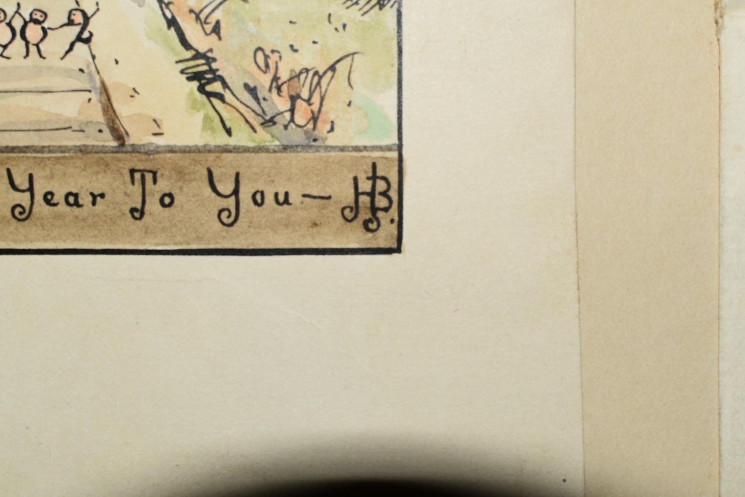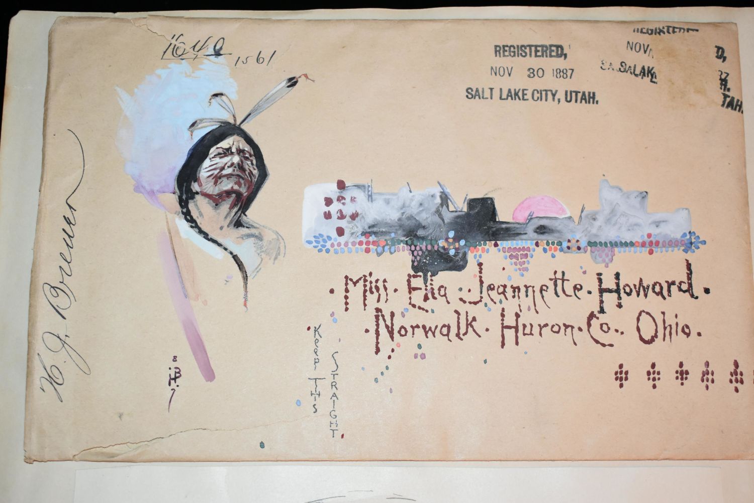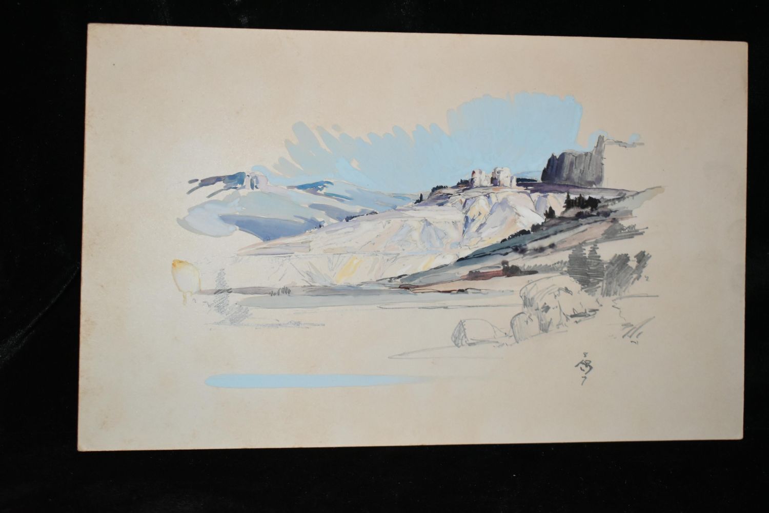 Early HENRY JOSEPH BREUER Painting 1887. Henry Joseph Breuer (Famous artist from San Francisco, California 1860-1932) Water color on canvas Utah Scenery 9 1/2 in. by 5 1/2 in. Signed "H.J.B 1887." H. J. Breuer was a close friend to the Lady he painted this for. The envelope although tattered from time is a work of art itself. The painting is in good shape from being in the envelope doing its life with exception of some smudging on the ends from being taken out of its envelope over time. On the back of the giant album page which was removed from the old photo book is an 1881 Happy New Year Card made by Henry Breuer. Not sure if the photo is him or not. The pencil sketching is by another artist that I could not identify but is included as it was glued to the page with the other works.