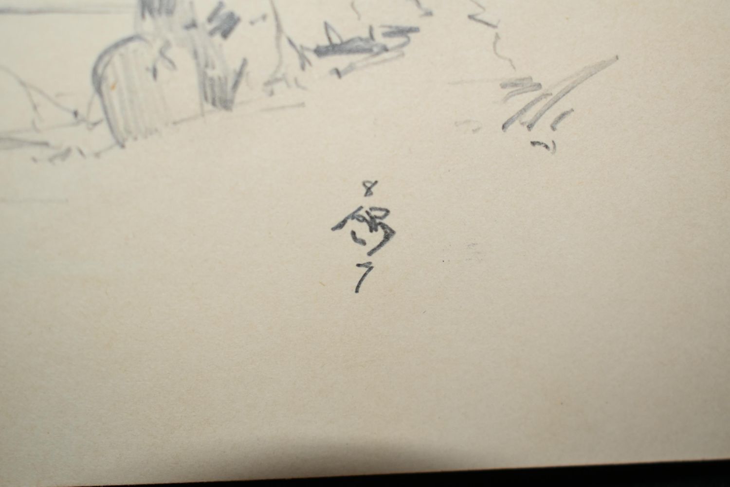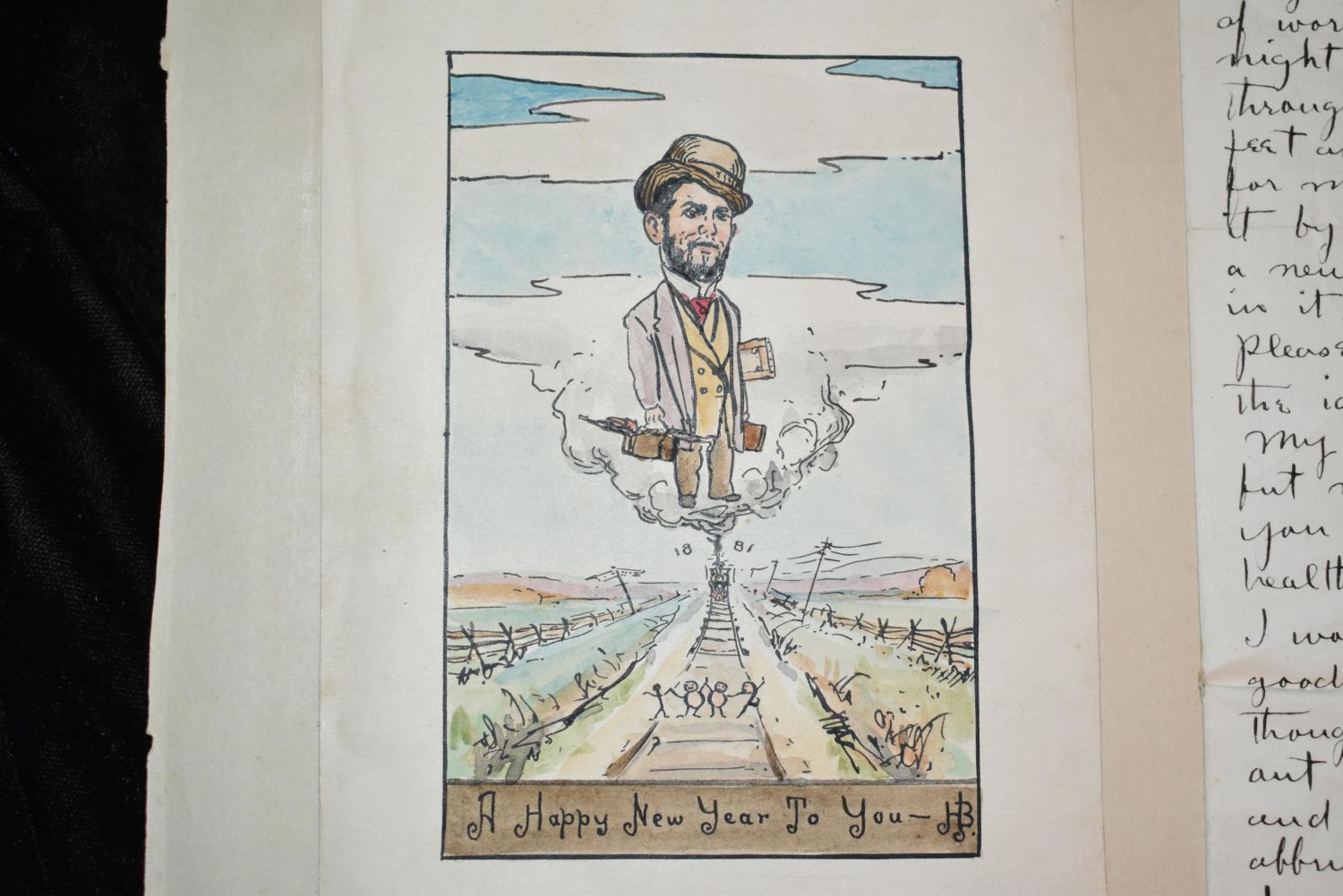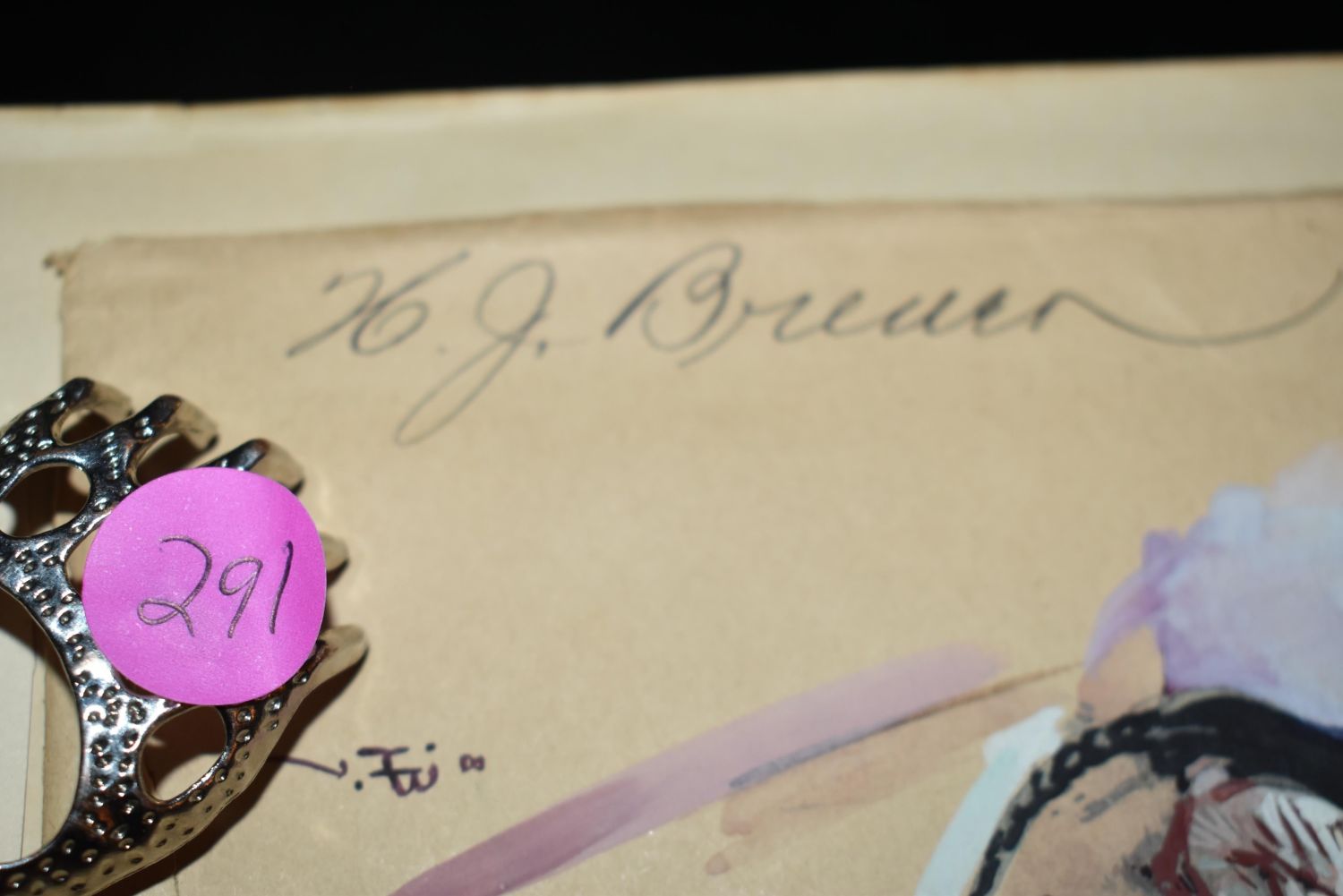 Early HENRY JOSEPH BREUER Painting 1887. Henry Joseph Breuer (Famous artist from San Francisco, California 1860-1932) Water color on canvas Utah Scenery 9 1/2 in. by 5 1/2 in. Signed "H.J.B 1887." H. J. Breuer was a close friend to the Lady he painted this for. The envelope although tattered from time is a work of art itself. The painting is in good shape from being in the envelope doing its life with exception of some smudging on the ends from being taken out of its envelope over time. On the back of the giant album page which was removed from the old photo book is an 1881 Happy New Year Card made by Henry Breuer. Not sure if the photo is him or not. The pencil sketching is by another artist that I could not identify but is included as it was glued to the page with the other works.