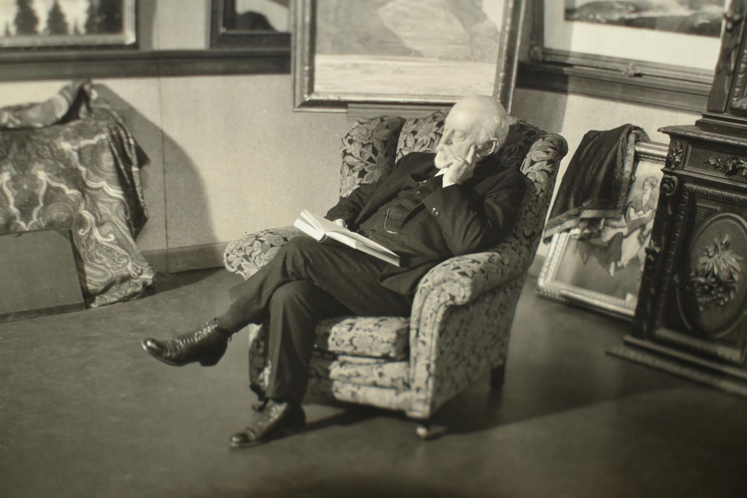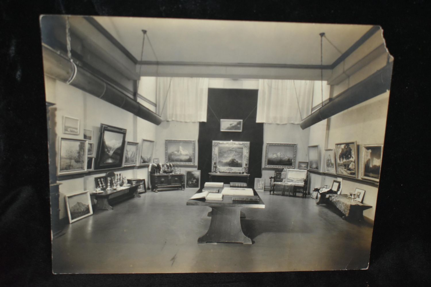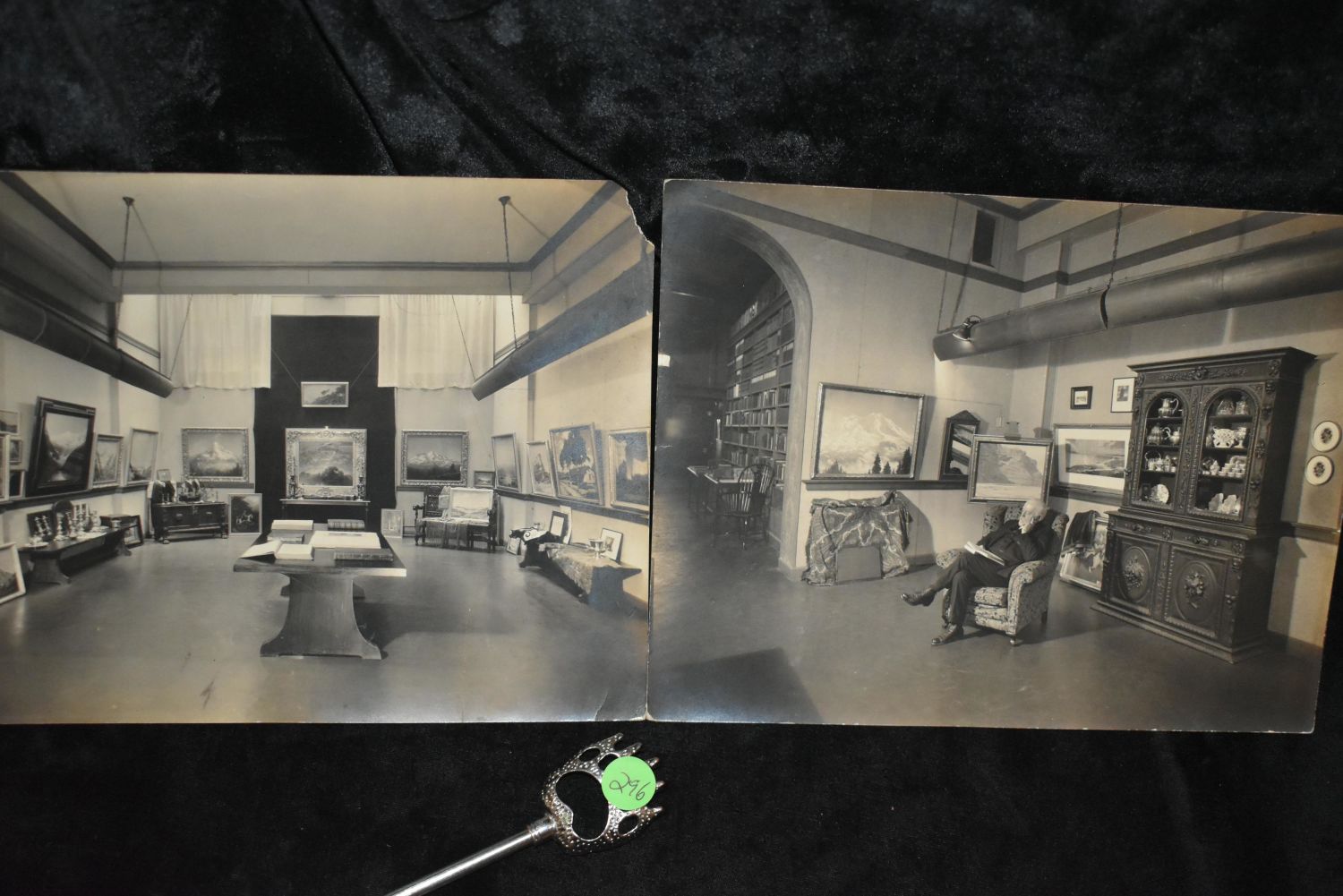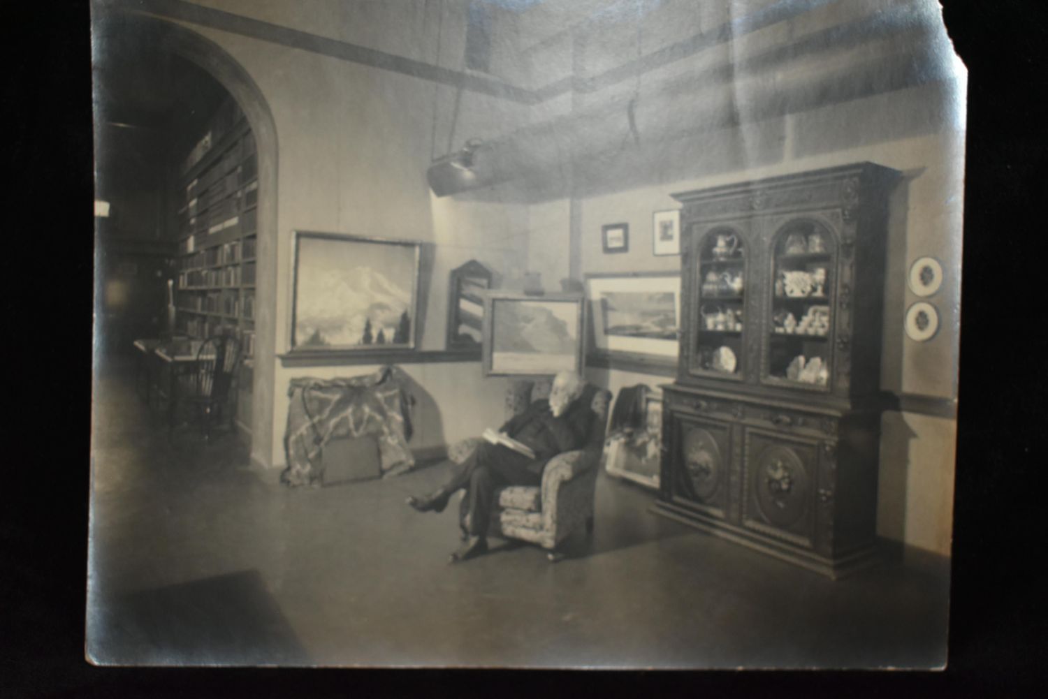 HENRY JOSEPH BREUER Photo’s 1920’s. HENRY JOSEPH BREUER (Famous Artist from San Francisco, California 1860-1932) Two Large Photo’s of HENRY JOSEPH BREUER’s Studio/Gallery. One picture of him reading a book in his studio/gallery. The other is a picture of his main show room with his favorite works. They most likely came with his signed photo above in 1926. Both have a piece tore off in the top right corner. 9 5/8" by 7 1/2".
