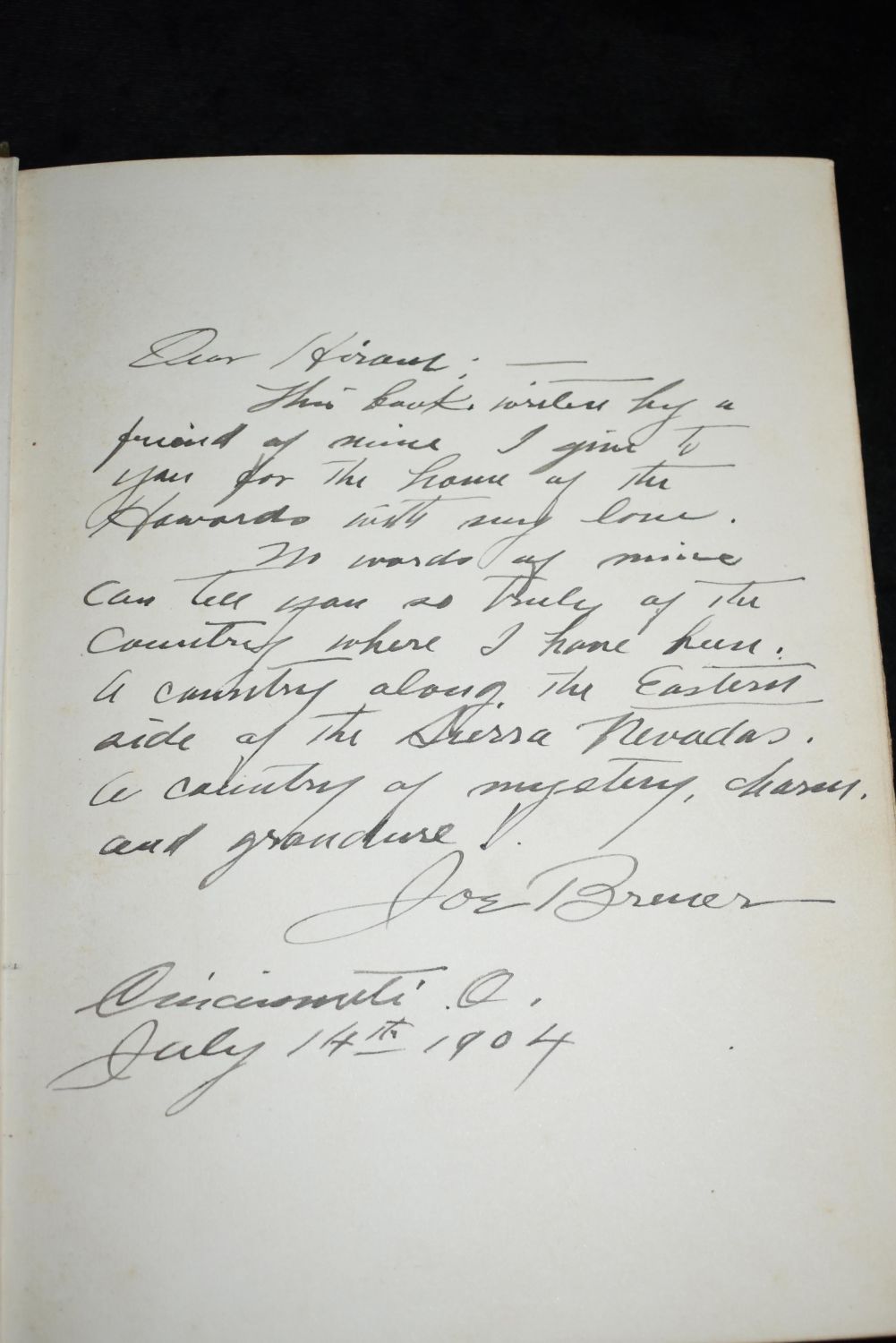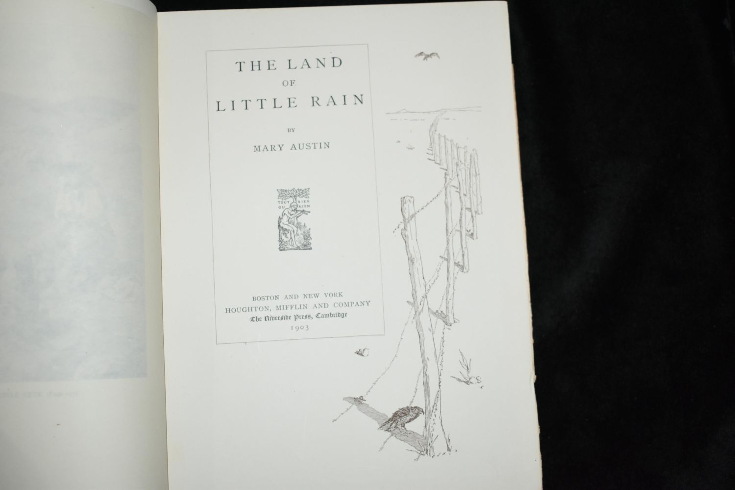The Land of Little Rain signed Breuer, Joseph 1903 The Land of Little Rain by Jane Austin. Published by Houghton, Mifflin and Company 1903. 1st Edition. Signed with a page long note on the 1st blank page by famous artist Henry Joseph Breuer to his friend Hirem who he gave the book to. Very Good + condition. Hardback Original publishers green cloth with gold, green and white embossing. 281 pages 8 5/8" by 6 5/8"