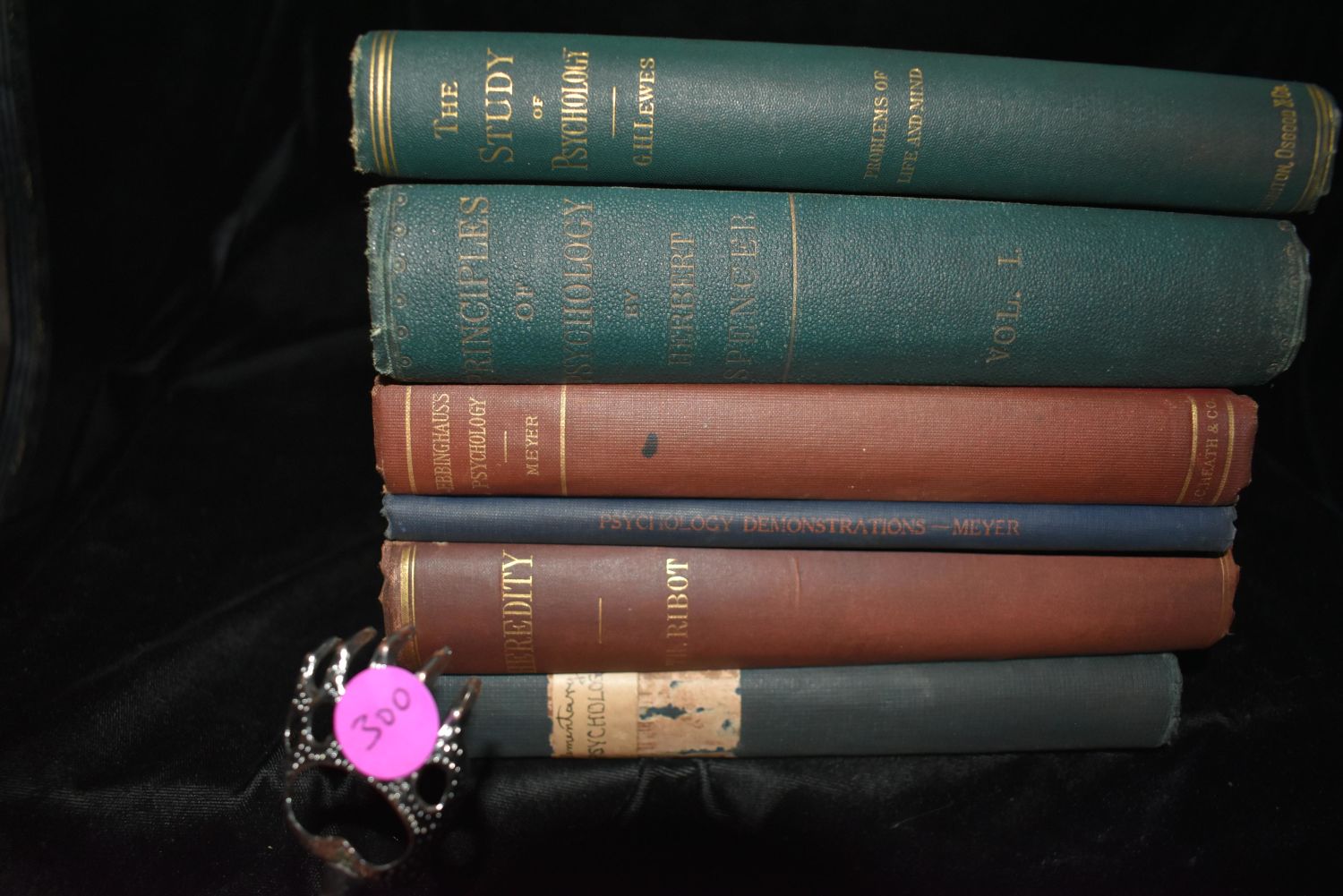 6 Antique Psychology Books. Heredity by T. H. Ribot 1874; Psychology by Hermann Ebbinghaus 1908; Problems of Life and Mind George Henry Lewes 1879; Elementary Psychology by Daniel Putnam 1889; A Brief Manual of Psychological Demonstrations by Max Meyer 1922; and Principles of Psychology Vol I by Herbert Spencer. All Covers have some to a lot of wear but are still intact. Overall good condition.