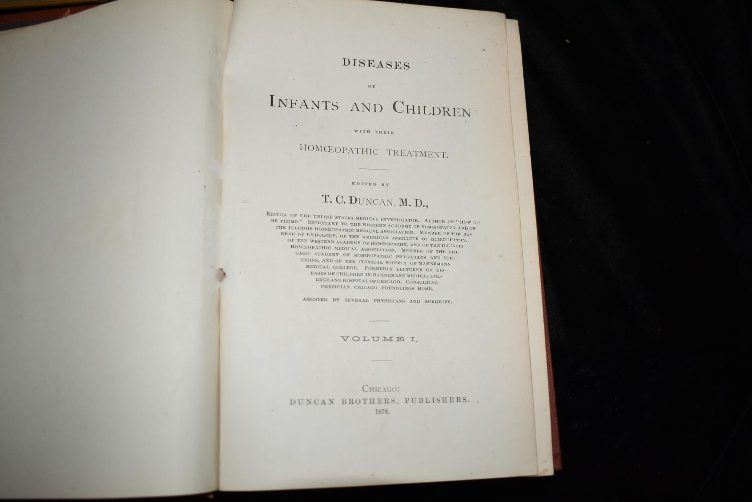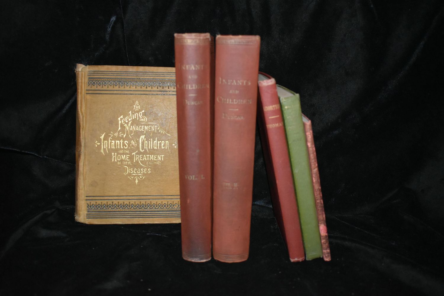 6 Antique Medical Books on Children 1800’s. Infants and Children by Duncan Vol 1 and 2, 1878; The Care of Infants by Jex-Blake 1884; Abortion by Thomas 1893; The Care and Feeding of Children by Holt 1928; and The Feeding and Management of Infants and Children and the Home Treatment of their Diseases (missing Infront piece, this book in the group is in rough shape) by Duncan 1880. All Covers have some to a lot of wear but are still intact. All are in Good condition except for the yellow one. Its all there but has been very used.