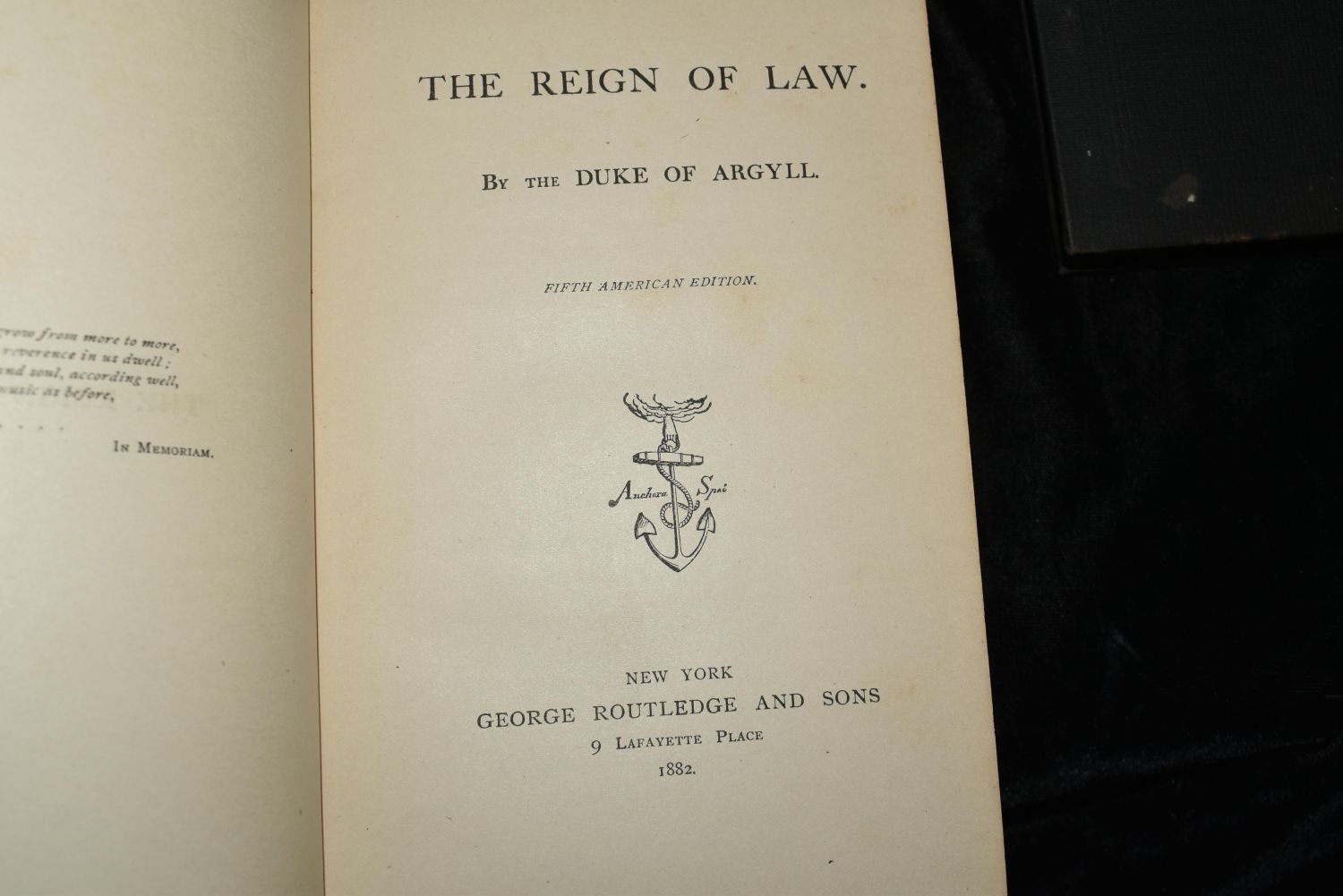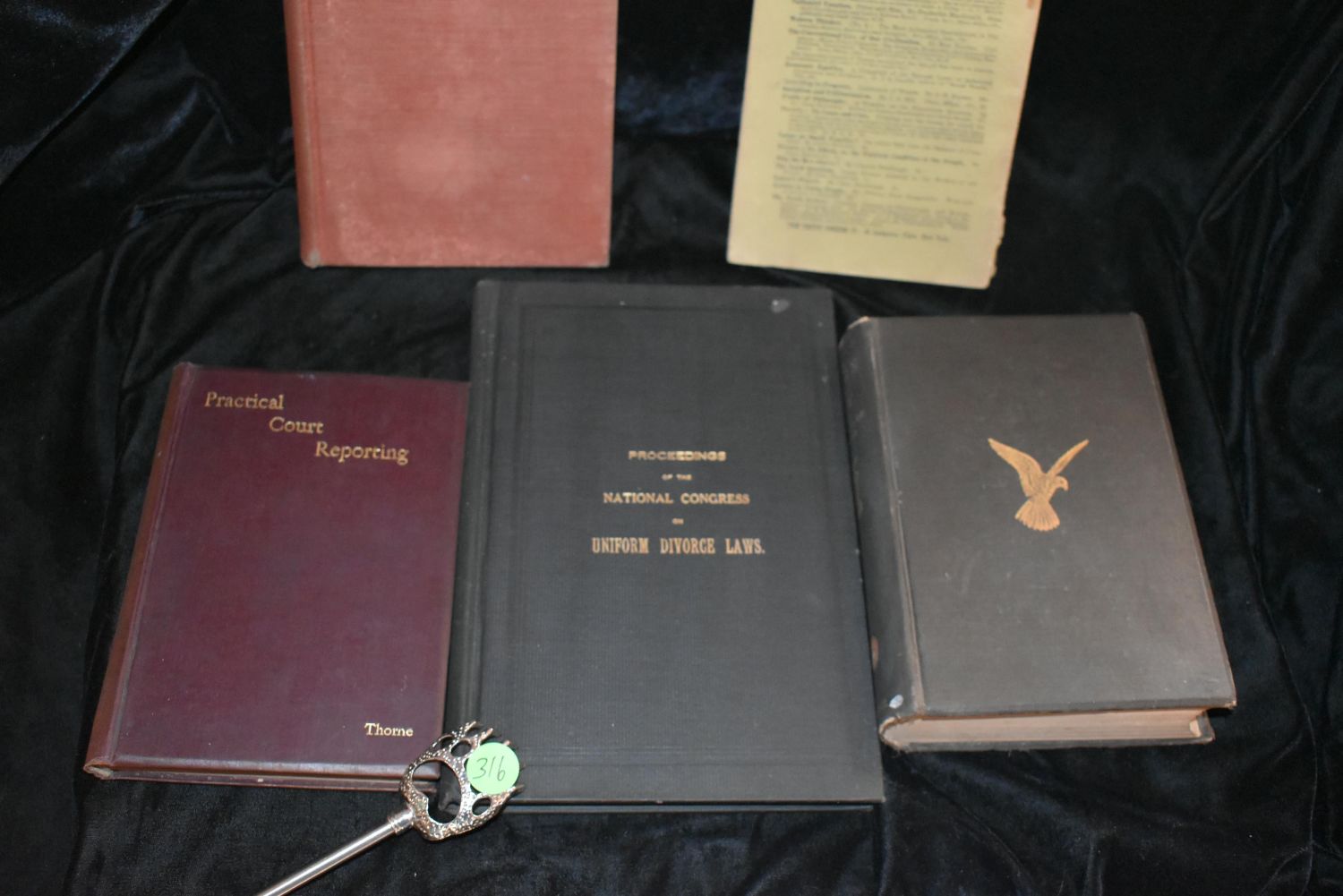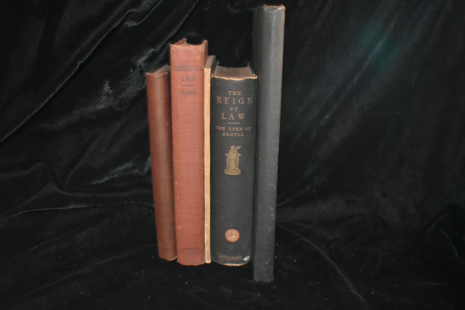 5 Antique Law Books 1884-1913. The Reign of Law by the Duke of Argoyll. New York: George Routledge and Sons 1884; Proceedings of the National Congress on Uniform Divorce Laws Harrisburg Publishing Company 1906; Practical Court Reporting by H. W. Thorn 1892; Commercial Law by Curtis Gano 1913; Economic Quities by J. K. Ingalls 1887 (Paperback). All are in fair to very good condition. Tallest book is 9 1/2 by 6 1/8"