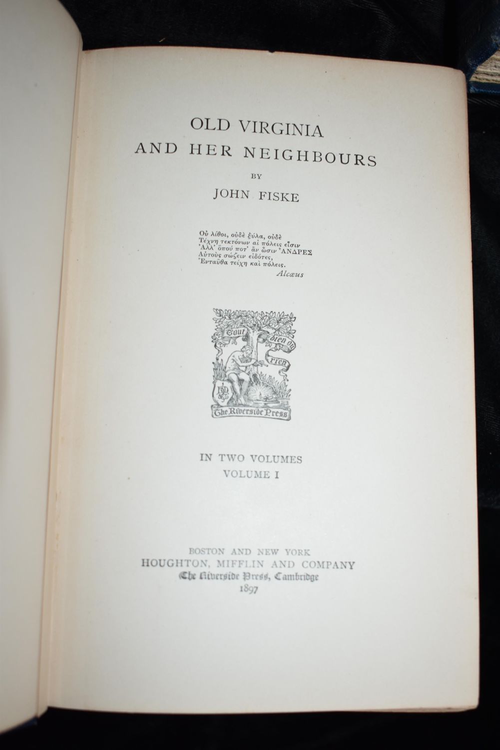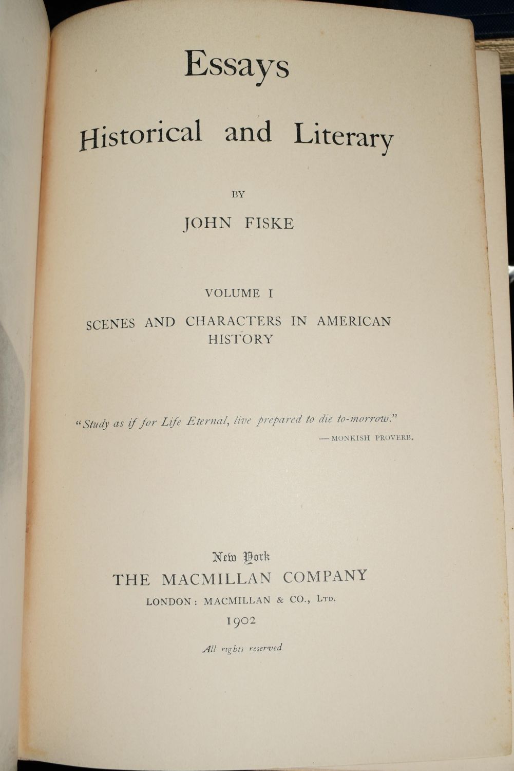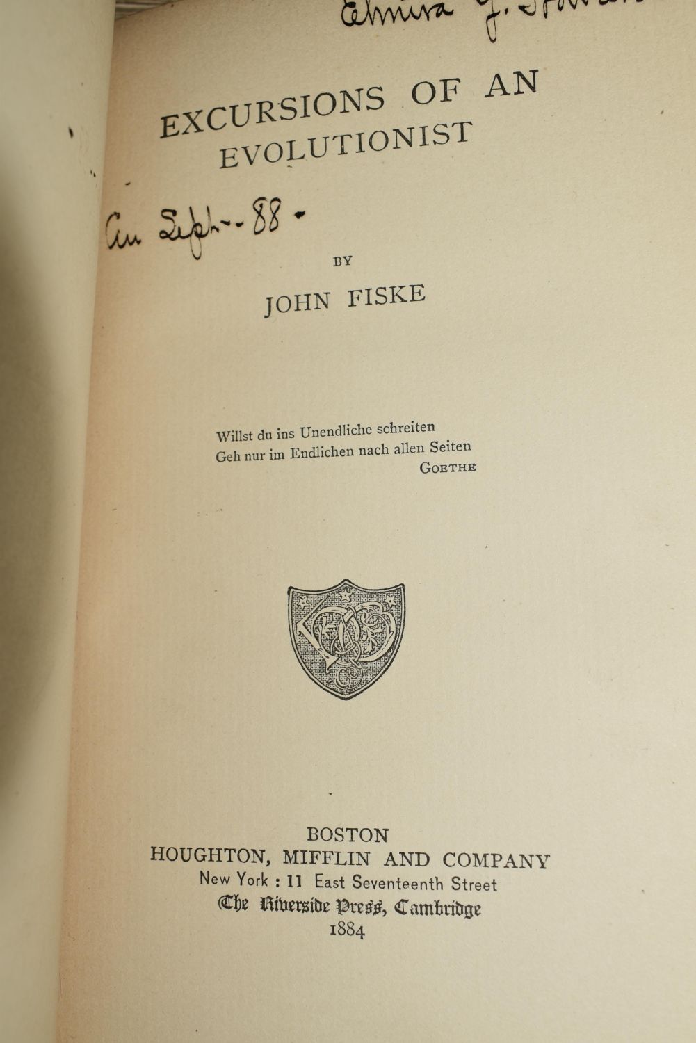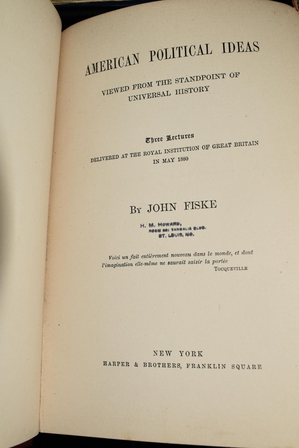 6 John Fiske Books One First Edition. American Political Ideas by John Fiske 1885 1st Edition very good shape; Excursions of an Evolutionist 1884; Old Virginia and Her Neighbors 1897 Vol 1 and 2; Essays Historical and Literary Volumes 1 and 2. Evolutionist book is a little rough. The others are all in good shape with some shelf wear and a little foxing to pages. Tallest book is 8 7/8" by 6"