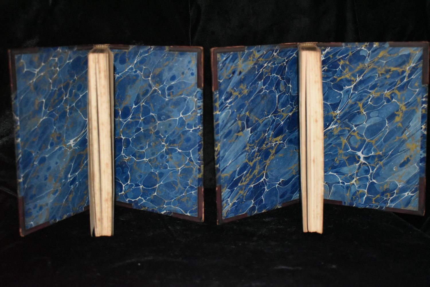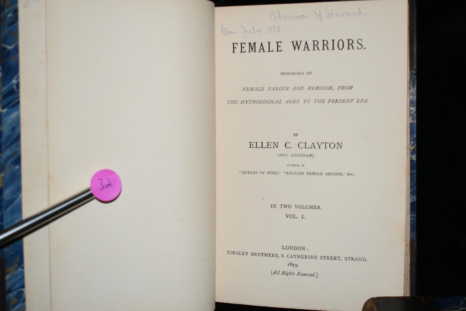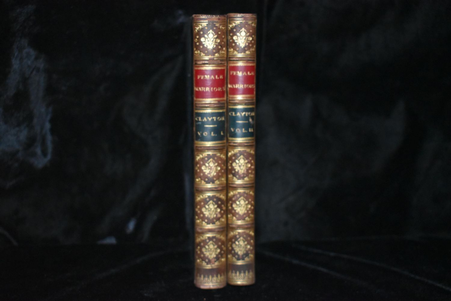 1879 FEMALE WARRIORS. Memorials of Female Valour and Heroism, From the Mythological Ages to the Present Era by Ellen C. Clayton. Published by Tinsley Brothers London 1879. 2 Volume Set. Presumed 1st Edition. Hardback half leather with Victorian Colored boards inside and out. Very Good Condition. Some shelf wear to the center ridges on the spines and corners. 222 pages and 203 pgs. 8" by 5 5/8"