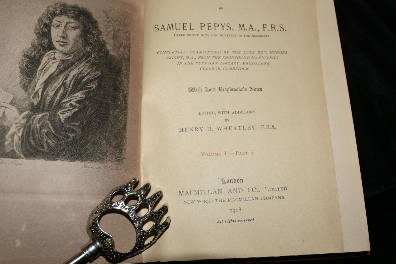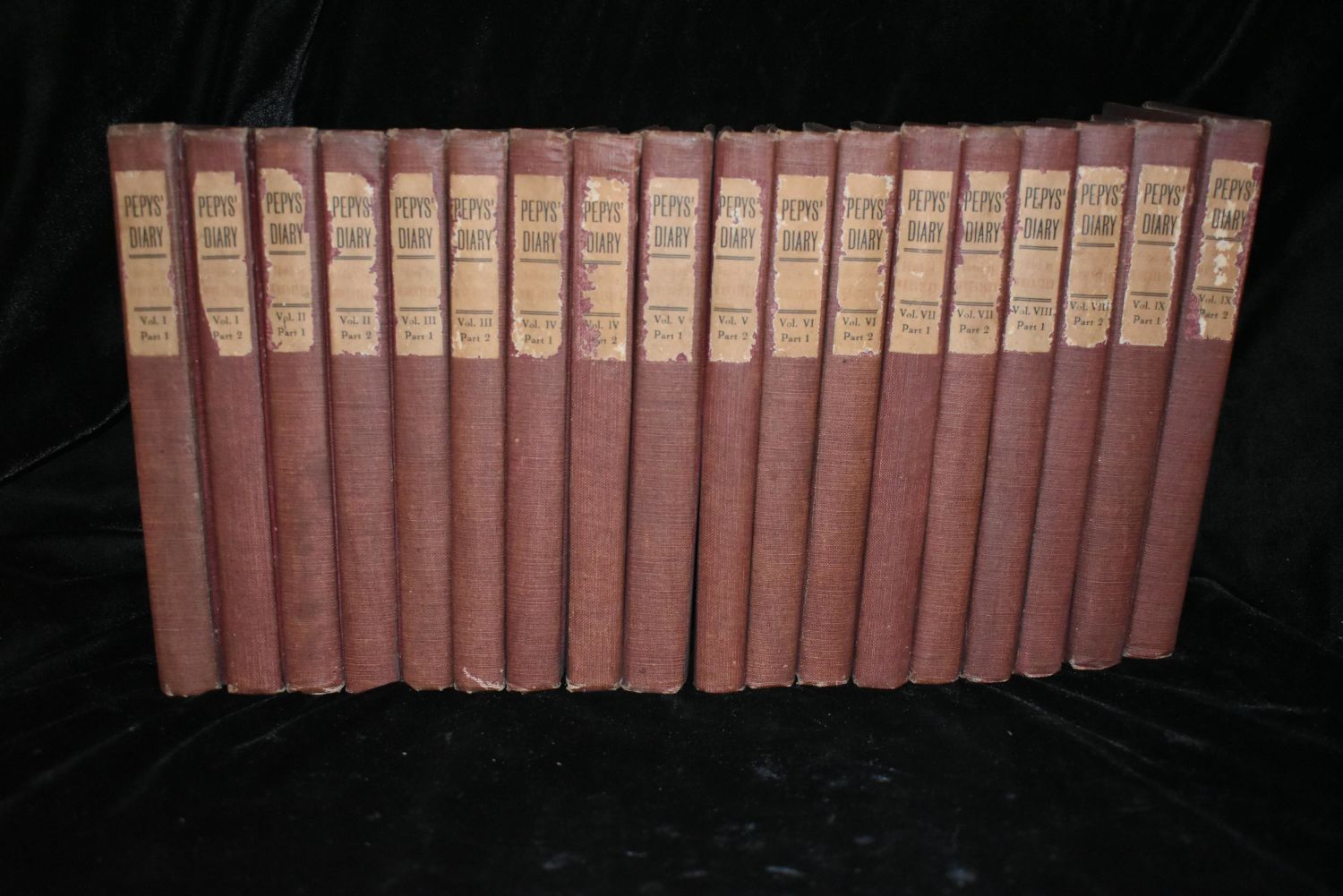 The Diary of Samuel Pepys 1918 Complete Set. The Diary of Samuel Pepys by Pepys, Samuel. Published by Macmillan and Co. 1918. 18 Volume complete set. All Volumes are in very good condition except for their name plates. Minor shelf wear and minor thumbing/foxing. Publishers original hardback red cloth. 7 1/2" by 5 1/8"