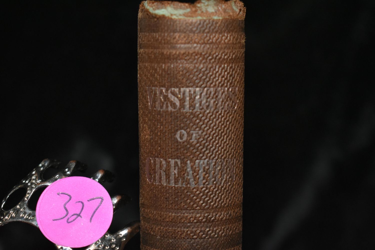 Robert Chambers 1858 Vestiges of the Natural History "Occult". Published by U. P. James in Cincinnati 1858. Occult book where the author didn’t enter his name at the time of this publication. Publishers original embossed brown cloth with gold print on spine. Very Good Shape for its age. Shelf wear to corners and fading to spine. Has some foxing to pages and darkening to page edges from age. 288 pgs 7 3/4" by 5"