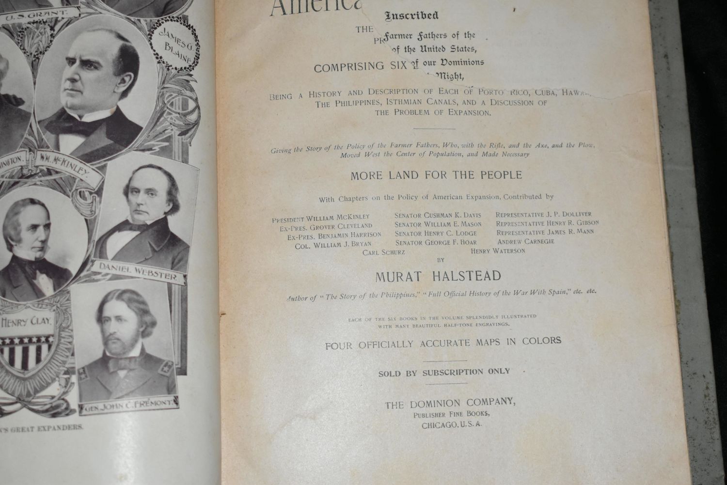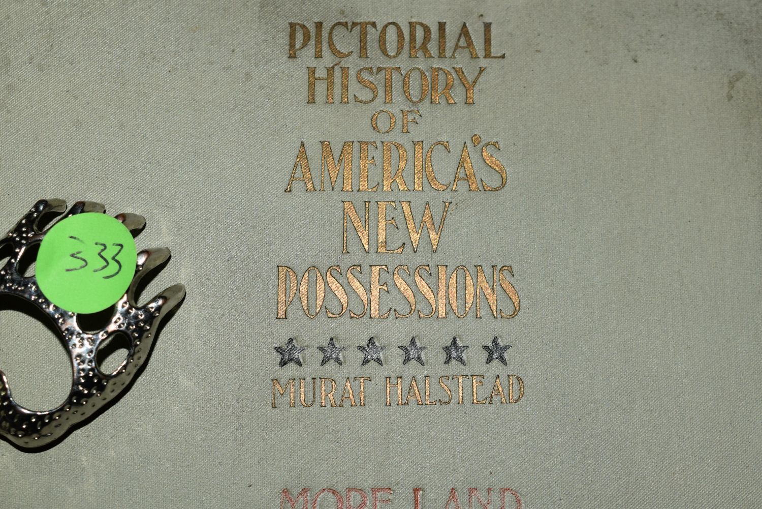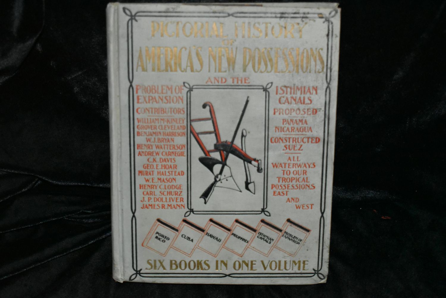 Pictoral History of America’s New Possessions 1899 by Murat Holstead. Published by The Dominion Company, Chicago 1899. This book is loaded with pictures, maps and illustrations pre 1900 of Porto Rico, Cuba, Hawaii, The Philippines, Isthmian Canals, and covers the problems faced in expansion of those areas. Publishers original grey cloth with red black and gold decorative cover. Good condition. Would be very good but part of the title page is missing. 681 pgs. 10" by 7 3/4"