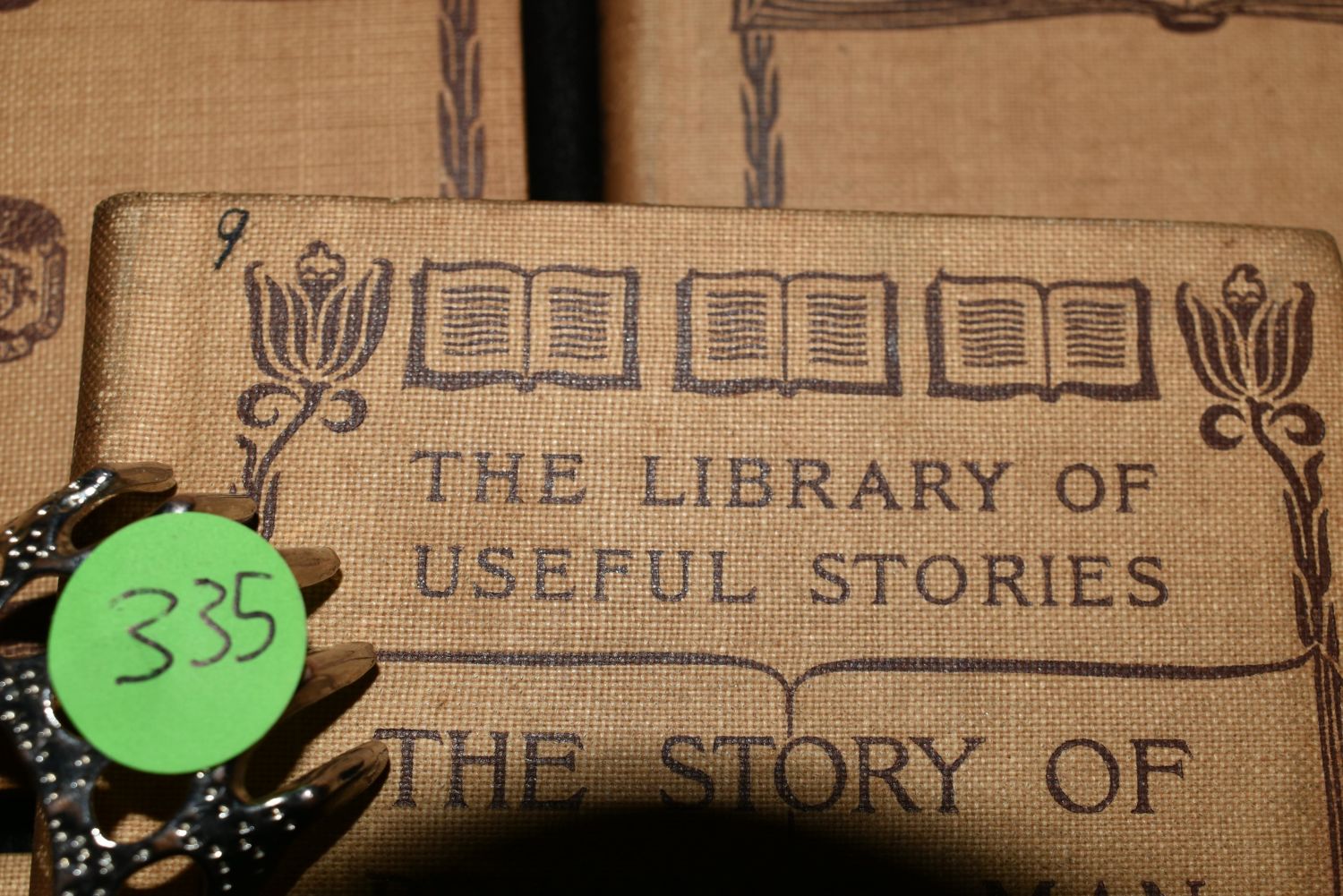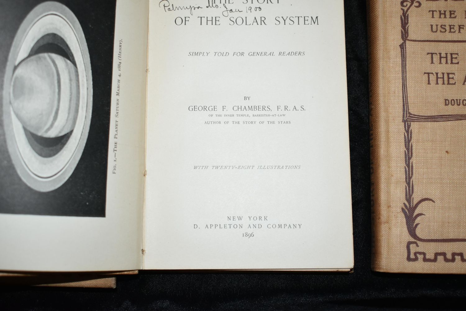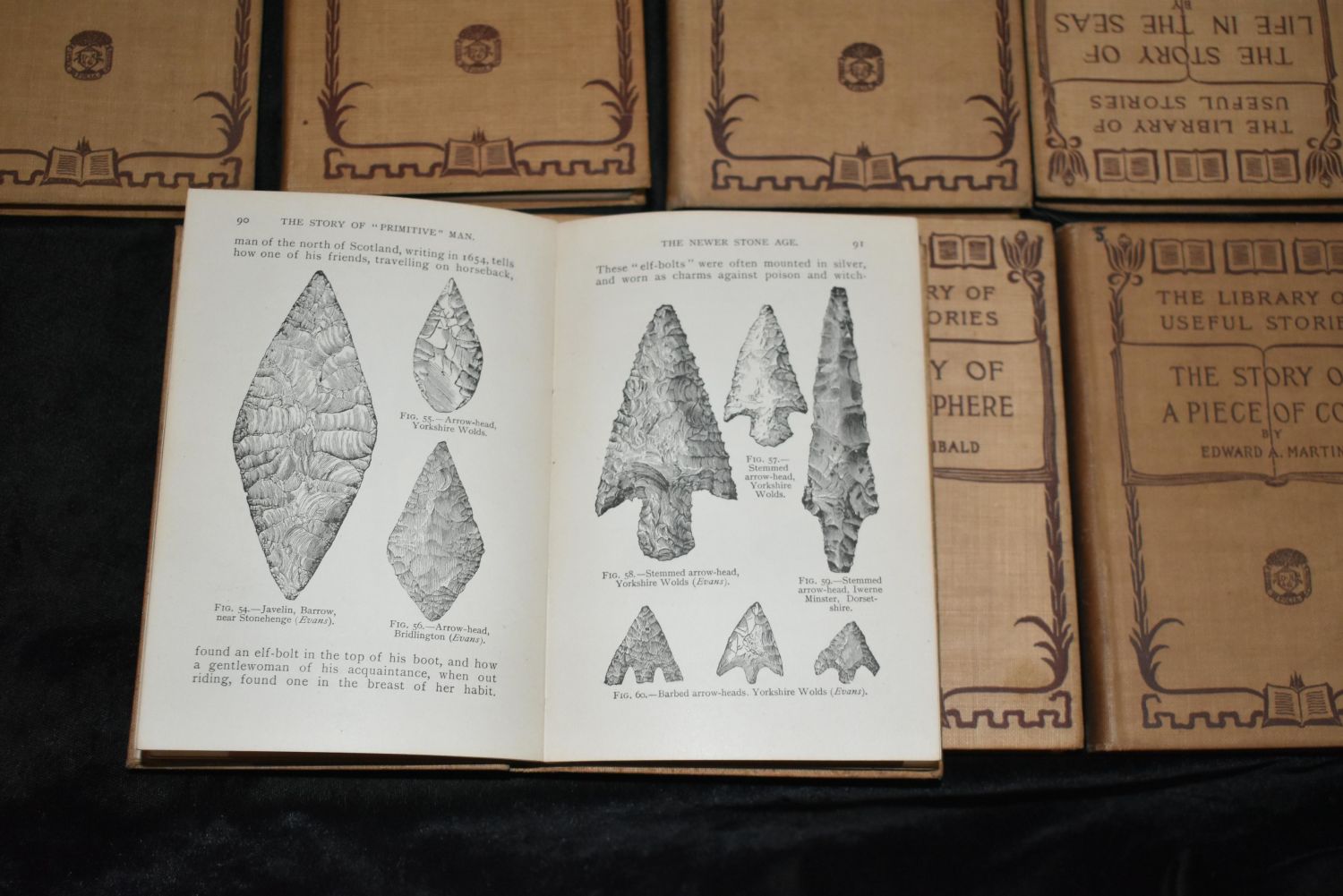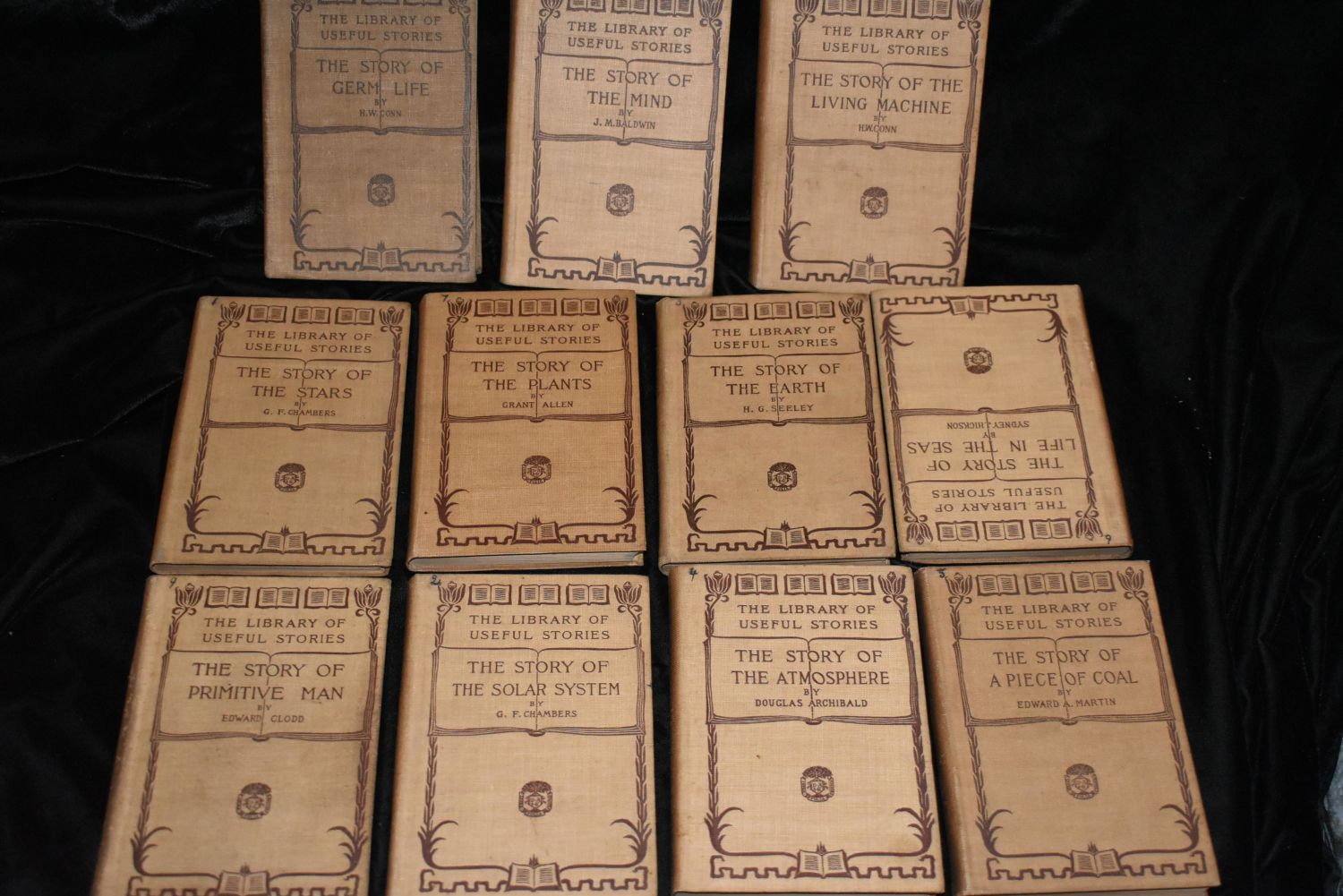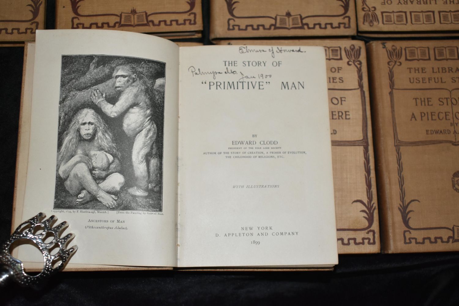 Eleven volumes from The Library of Useful Stories 1900 series, published by D. Appleton Company, comprising The Story of the Earth 1900, The Story of the Earth’s Atmosphere 1900, The Story of the Solar System 1896, The Story of the Stars 1900, The Story of a Piece of Coal 1900, The Story of Primitive Man 1899; The Story of the Mind, The Story of the Plants 1899, The Story of Life in the Seas 1898, The Story of the Living Machine 1899, and the Story of Germ Life 1897 by various authors. Each having uniform tan cloth boards with brown lettering. (10) All are in Good condition for their age. 1st owner numbered them on the top left corner of each booklet for easy reference. 6" by 4 1/8"