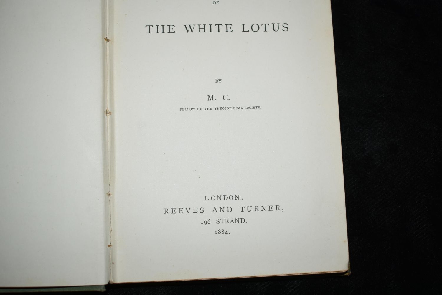 The Idyll of The White Lotus 1884 1st Ed (Theosophy0 Idyll of the White Lotus by Mabel Collins. Published by London, Reeves And Turner 1884. 1st Edition. Very Rare Book. Theosophy, occult related. Hardback original publishers green cloth with gold, white and silver embossing/print. Very Good Condition. Some shelf wear to the corners. Pages gold end all around. 141 pgs 5 1/8" by 7 3/8"