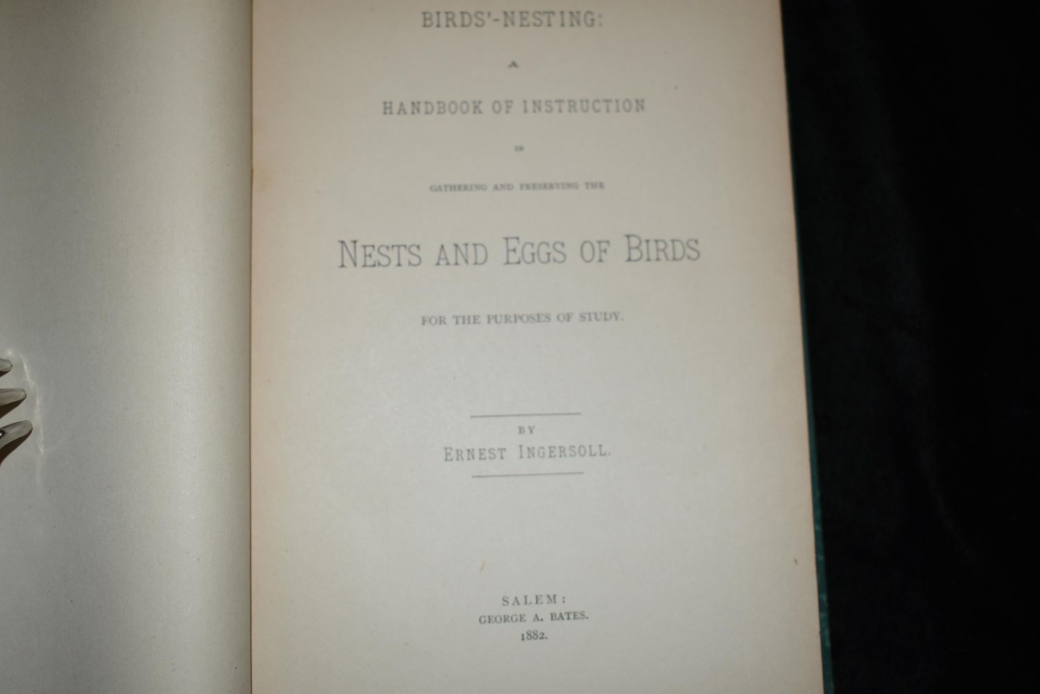 Birds’-Nesting: A Handbook of Instruction In Gathering and Preserving the Nests and Eggs of Birds for the Purposes of Study by Ernest Ingersoll. Published by George A. Bates 1882. 1st Edition. Original Publishers hardback with green cloth and gold print. Overall good condition. Fading to spine and some spotting to cover. Internally very clean copy. 110 pgs 7 5/8" by 5 5/8"
