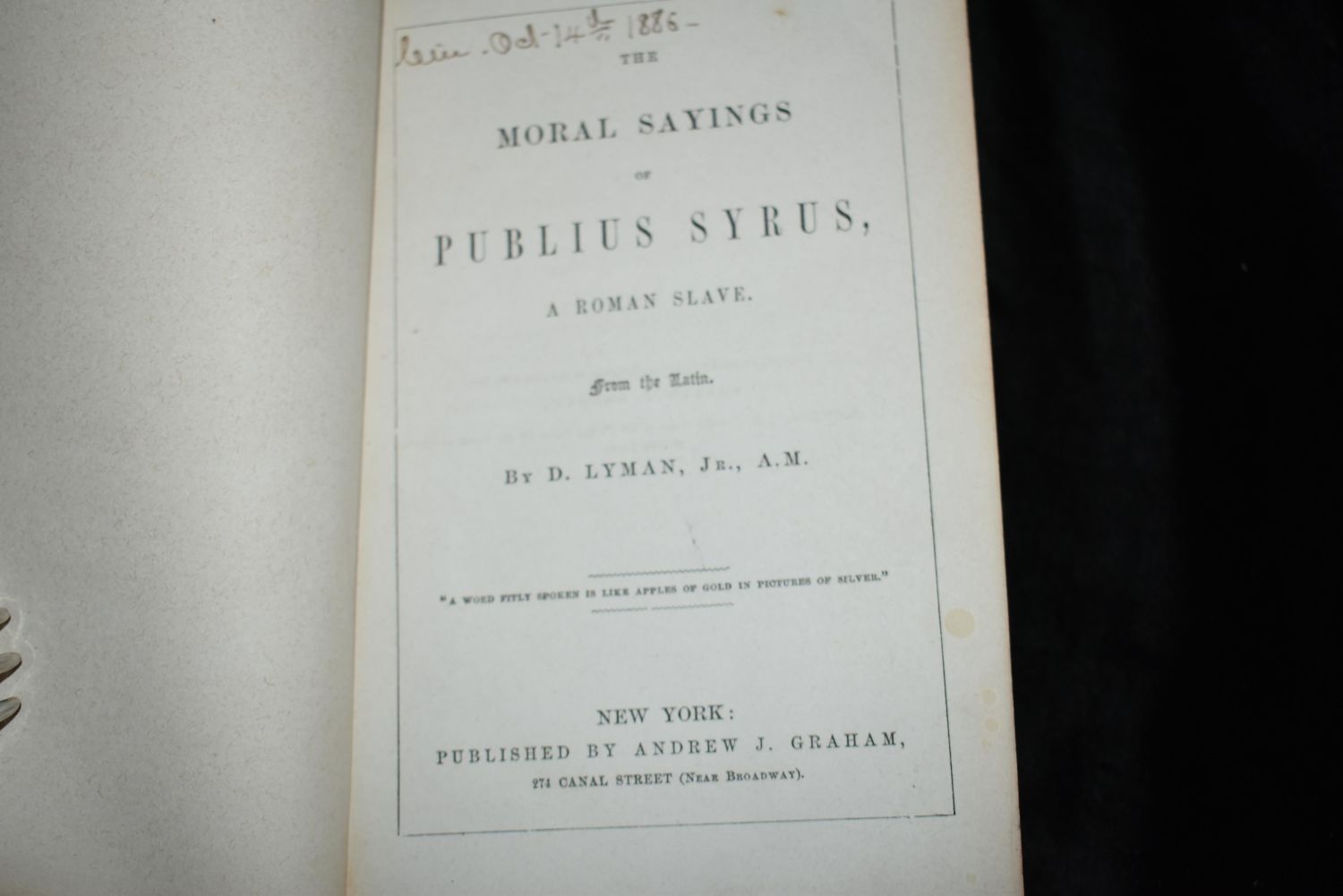 The moral sayings of Publius Syrus a Roman slave. From the Latin by Publilius, Syrus; Darius Lyman. Published by New York: Andrew J. Graham 1862. 1st Edition. Original publishers hardback in brown cloth with gold print. Very Good Condition. 88 pgs 7 1/2" by 5 1/8"