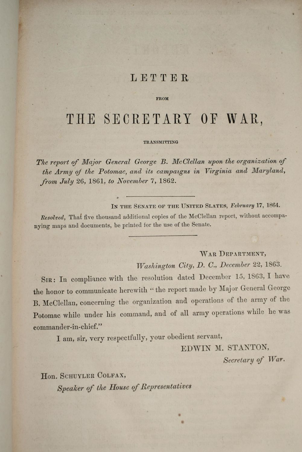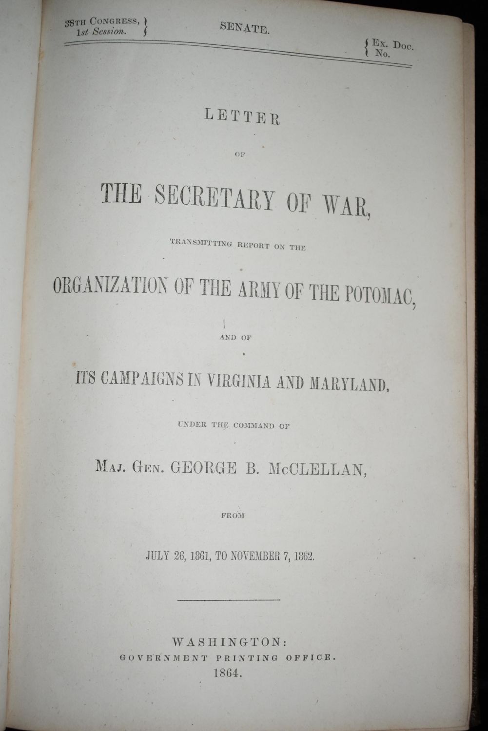 Letter of The Secretary of War 1862 Potomac Transmitting Report on Organization of the Army of the Potomac, and of Its Campaigns in Virginia and Maryland, under the Command of Maj. Gen. George B. McClellan, from July 26, 1861, to November 7, 1862. Published in Washington Government Printing Office 1864. Very good condition. Little shelf wear. Brown Cloth hardback. 242 pgs 9 1/8" by 6"