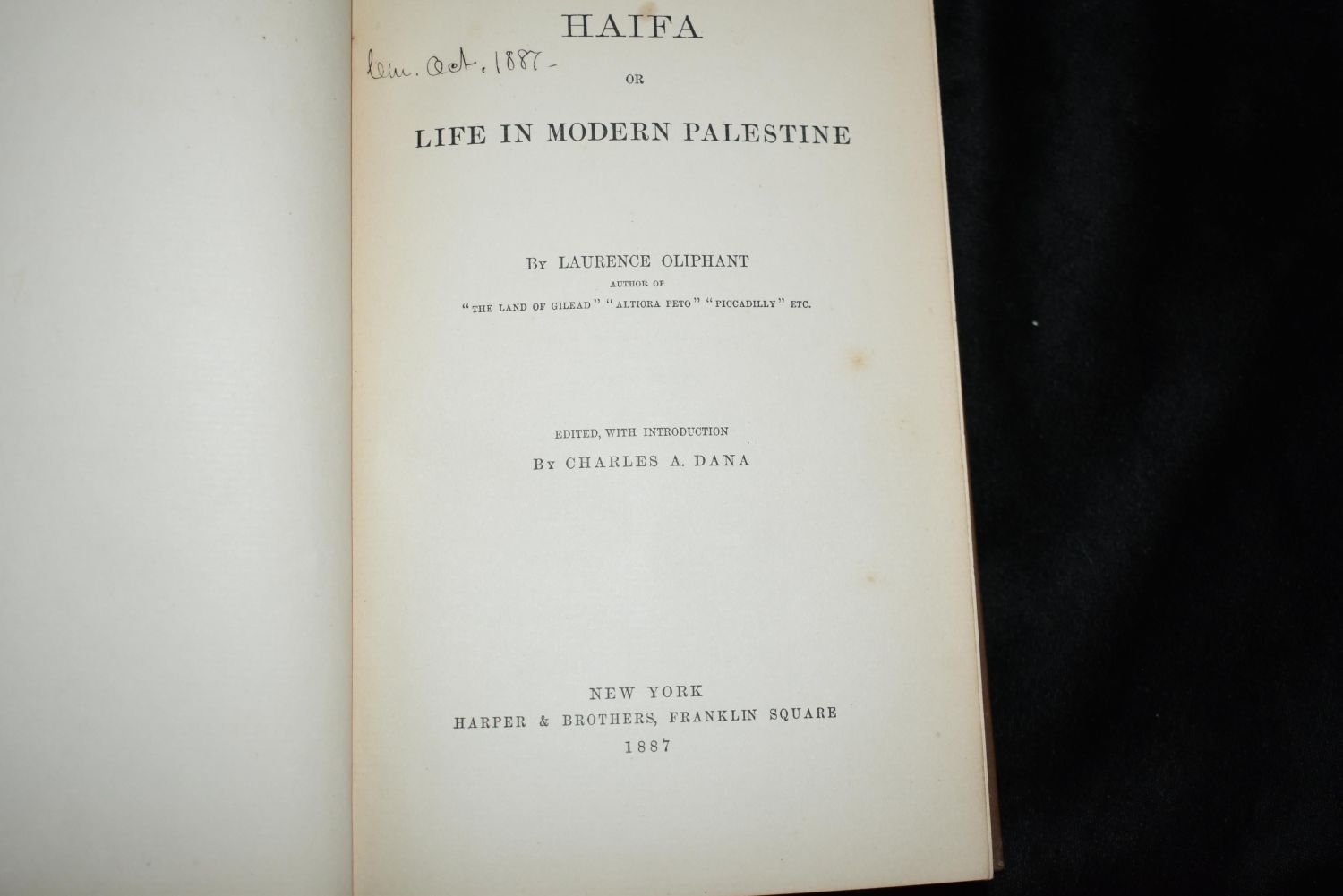 Haifa Or Life in Modern Palestine by Laurence Oliphant. Published by Harper & Brothers, New York 1887. 1st Edition. Original Publishers brown cloth with gold print. Very Good Condition. 369 pgs 8 1/8" by 5 5/8".
