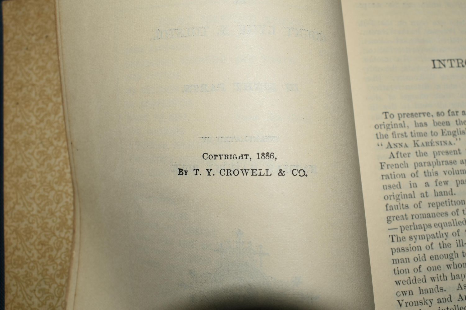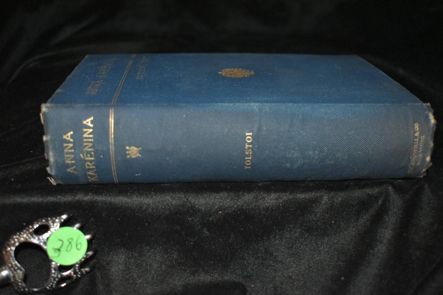 ANNA KARENINA in Eight Parts by COUNT LYOF N. TOLSTOI. Published by THOMAS Y. CROWELL & CO., NY 1886. 1st Edition in English. Publishers original blue cloth hardback with gold print/gilt. Very Good condition. Some shelf wear and age toning to pages. 773 pgs 7 3/4" by 5 3/8"