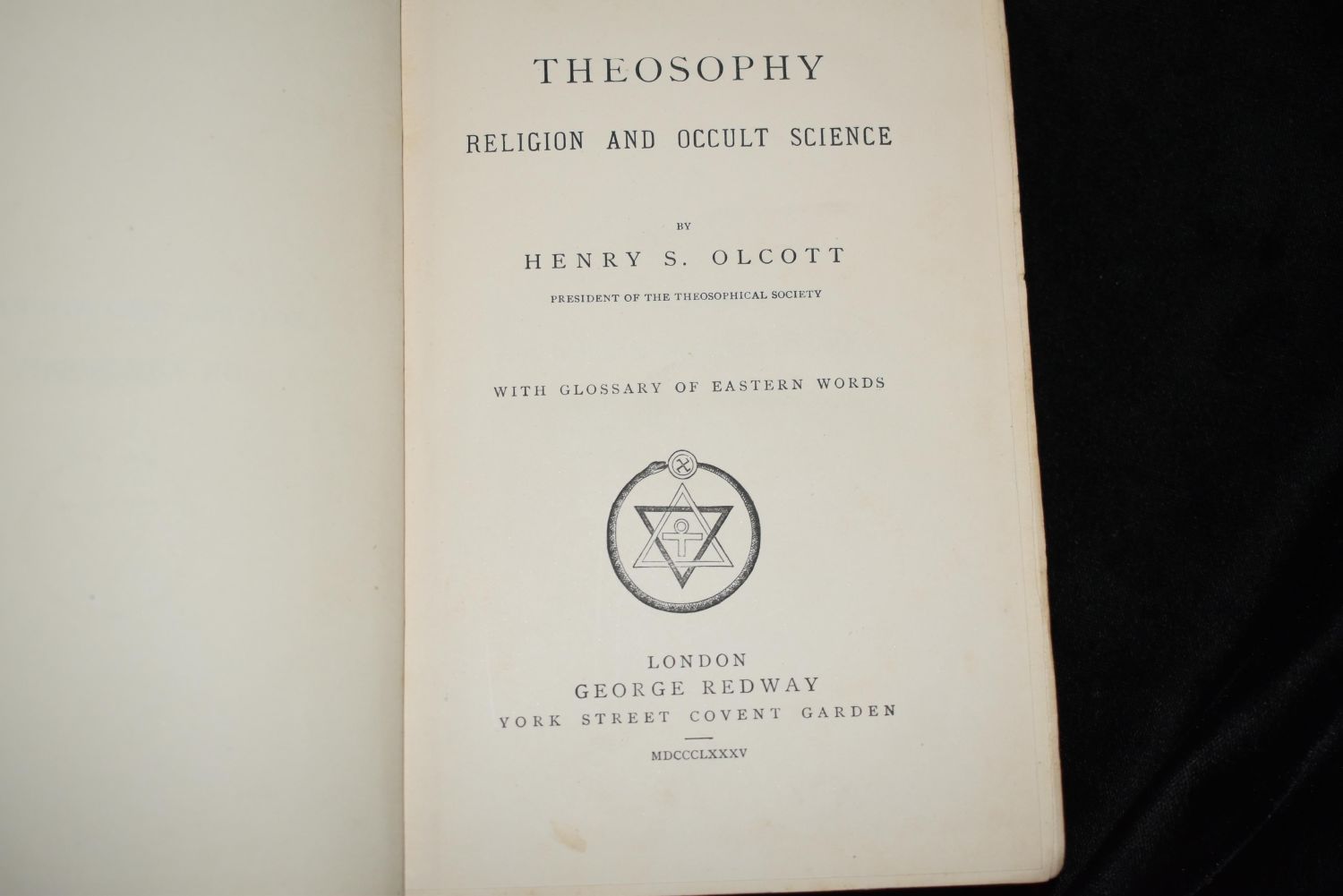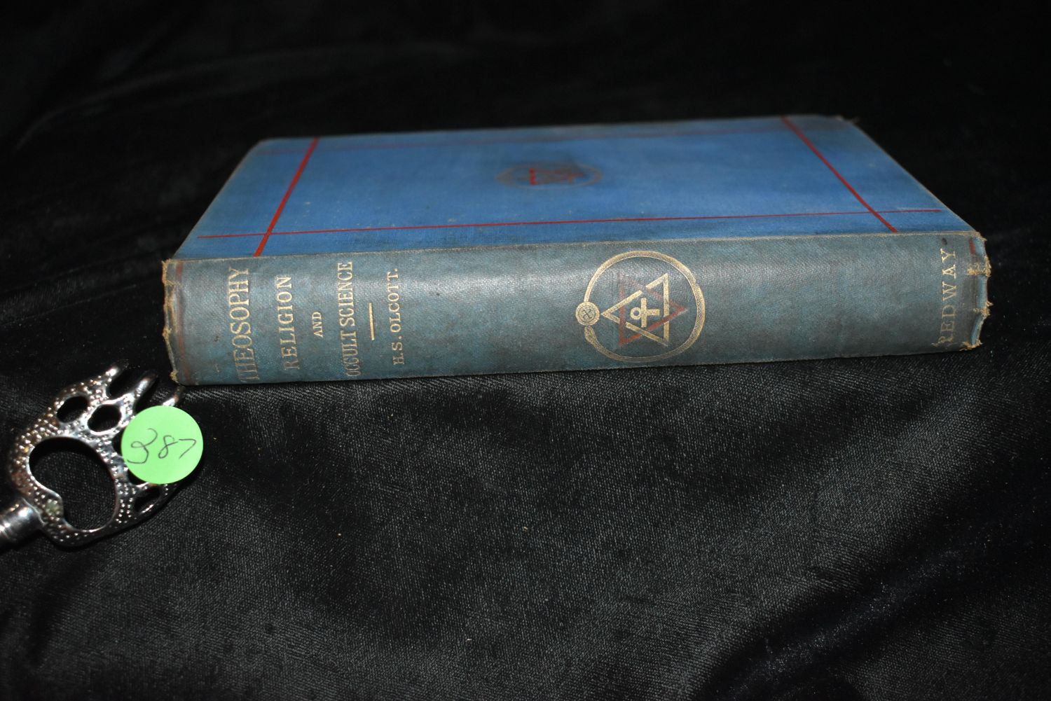 Theosophy, Religion and Occult Science by Henry S. Olcott. London: George Redway Publisher 1885. 1st Edition Extremely rare book. Publishers original blue cloth hardback with red and gold print/gilt. Cover has some shelf wear. Good Condition for its age. 363 pgs 7 3/4" by 5 1/8"